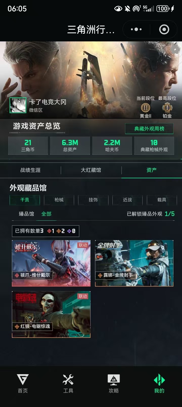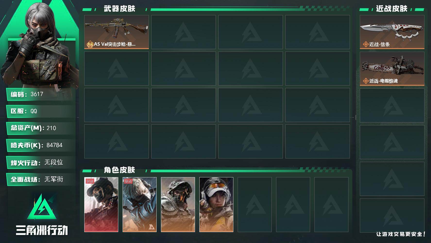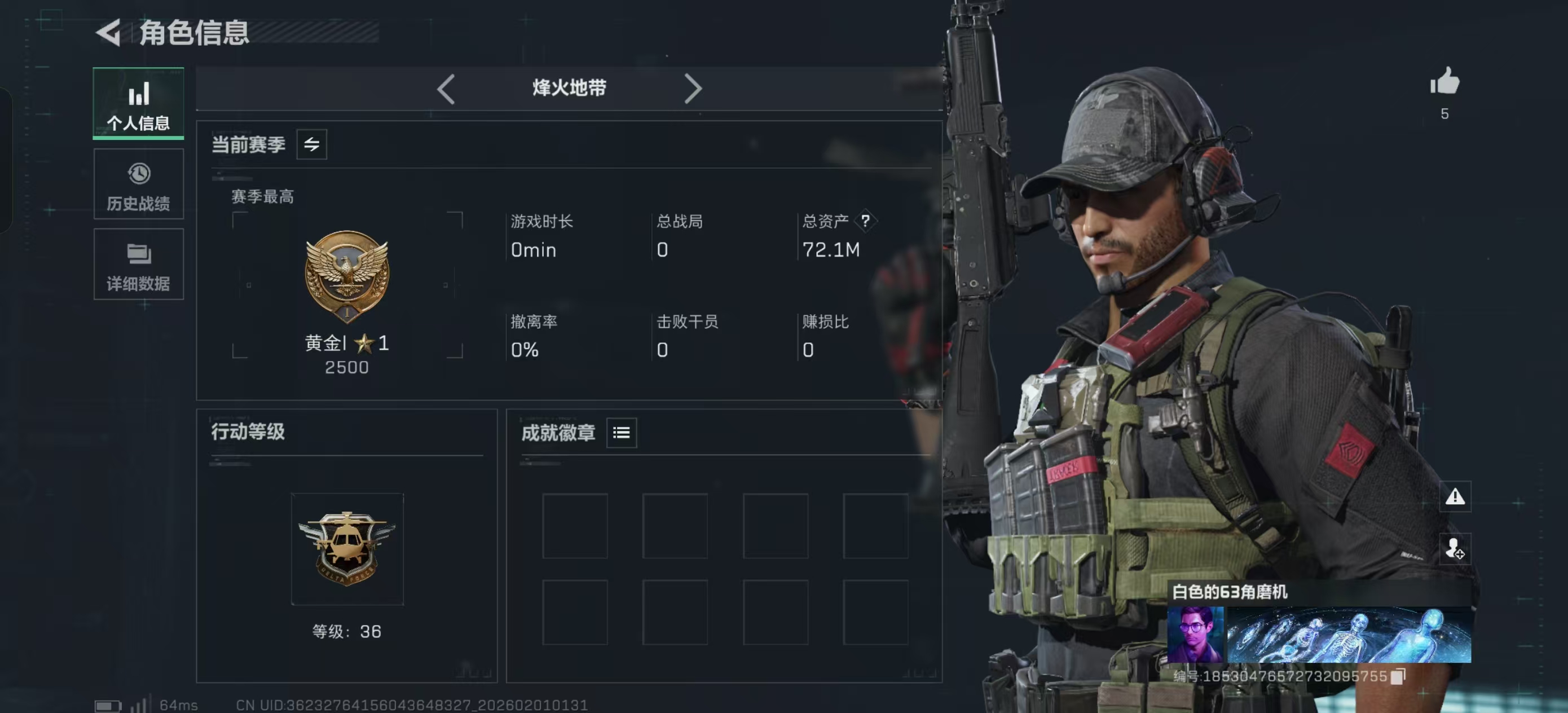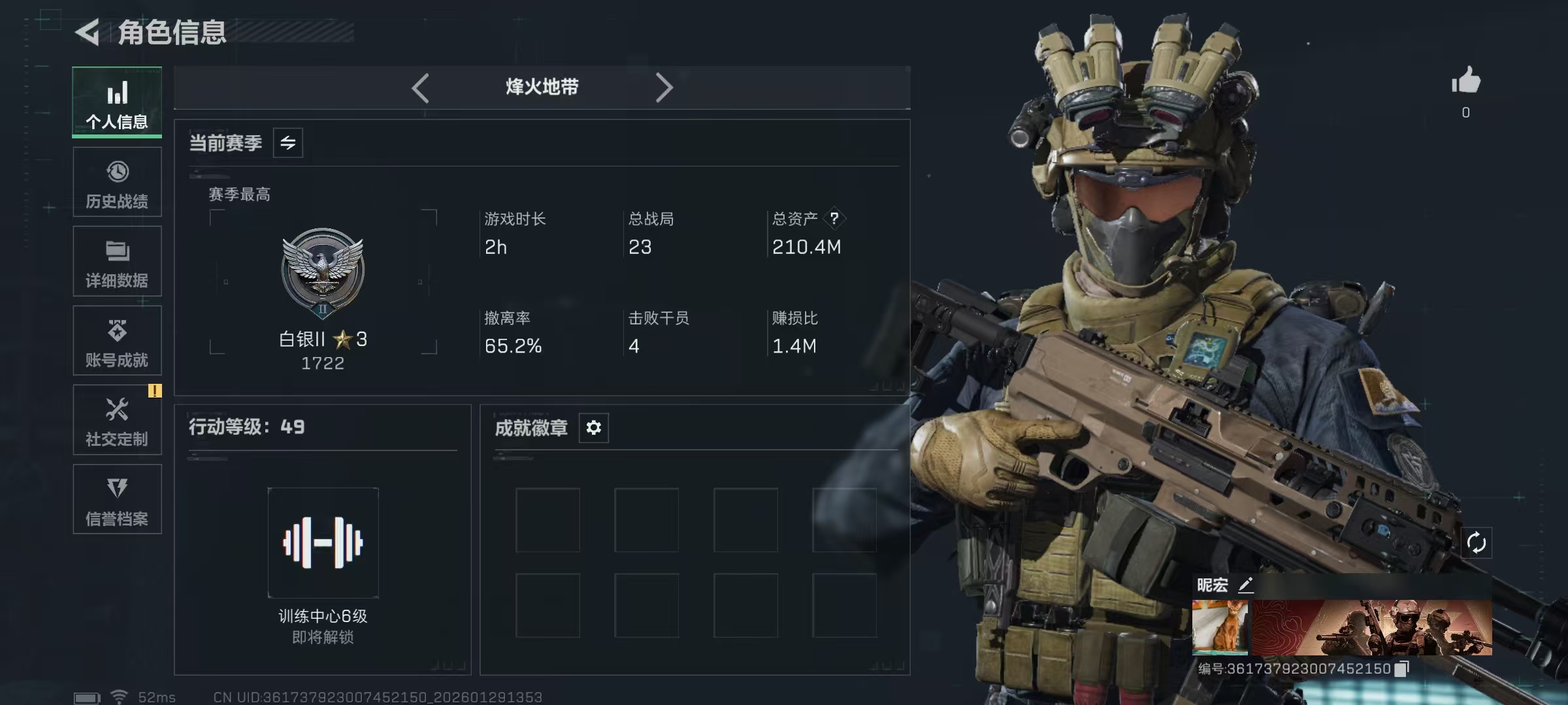 烽火段位黄金3 战场段位上等兵3 总资产84.1M 哈夫币4193W 挂饰12 近战1 枪械22 载具12