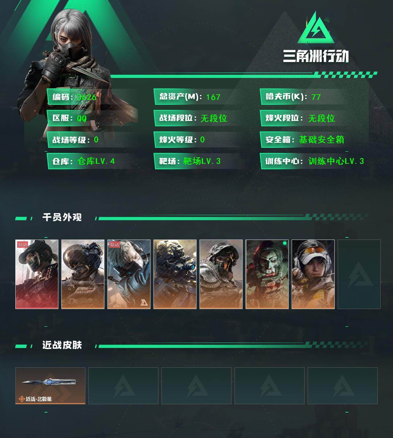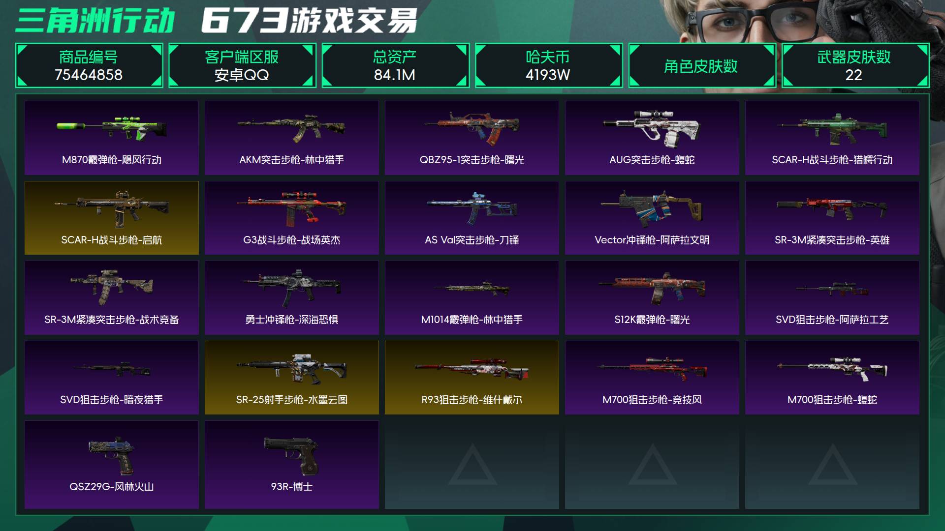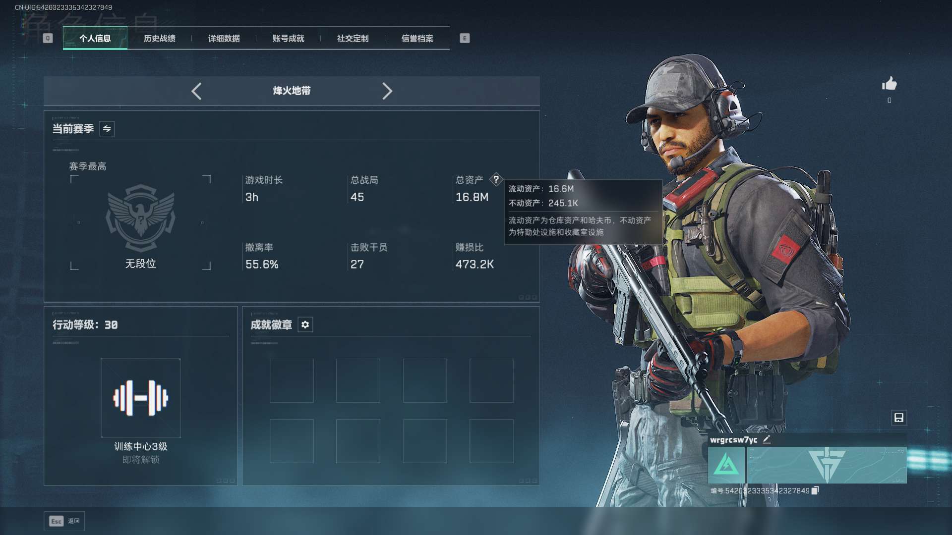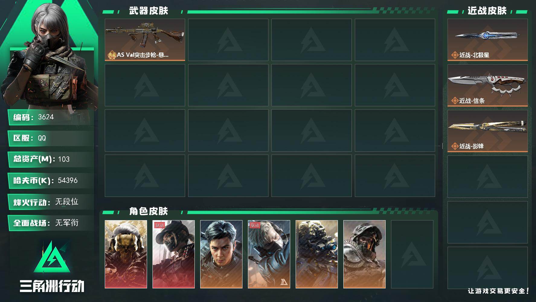 烽火段位黄金3 战场段位上等兵3 总资产84.1M 哈夫币4193W 挂饰12 近战1 枪械22 载具12