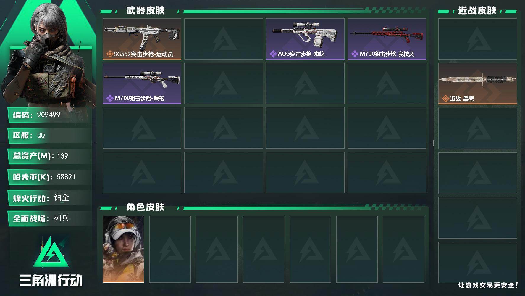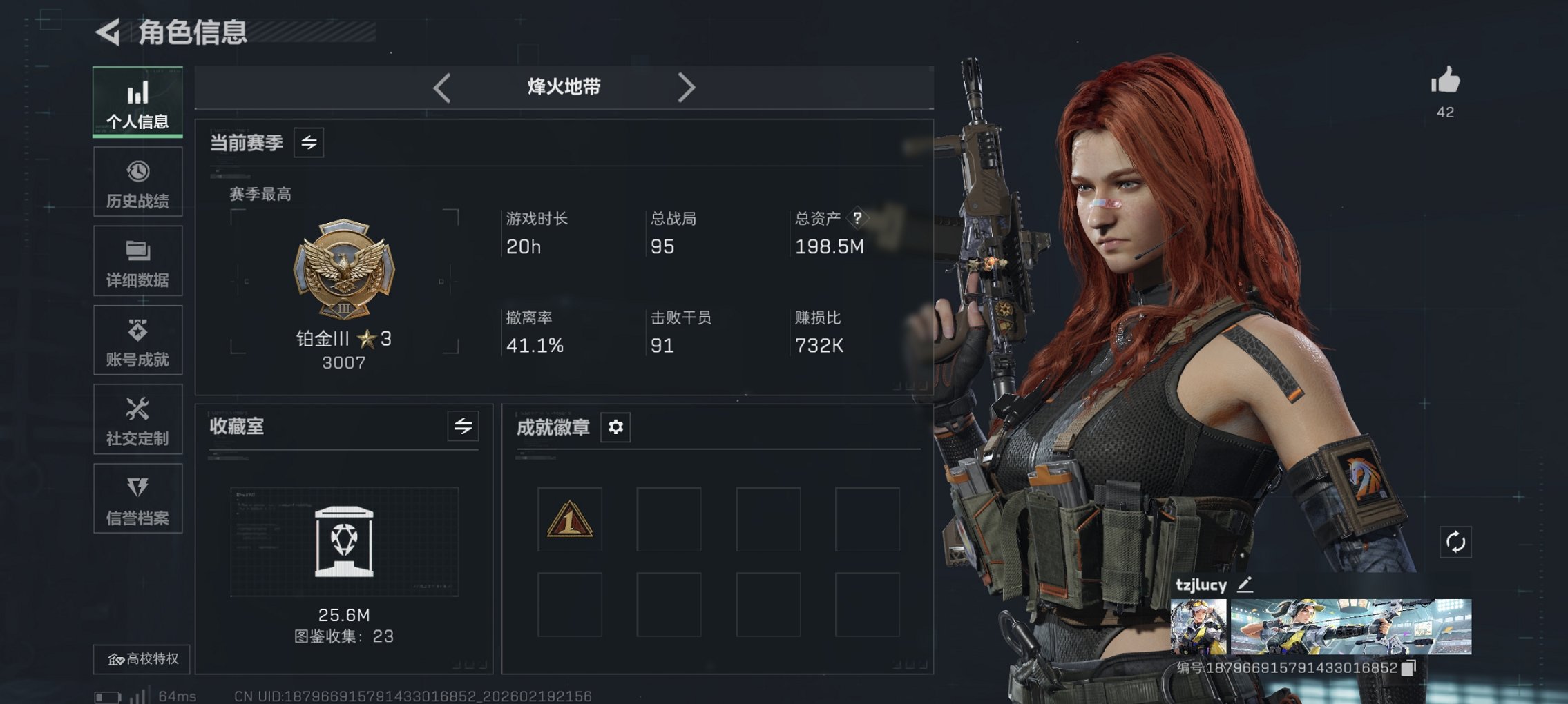 烽火段位黄金4 战场段位暂无段位 总资产12.7M 哈夫币24W 干员1 挂饰12 近战1 枪械65 载具9