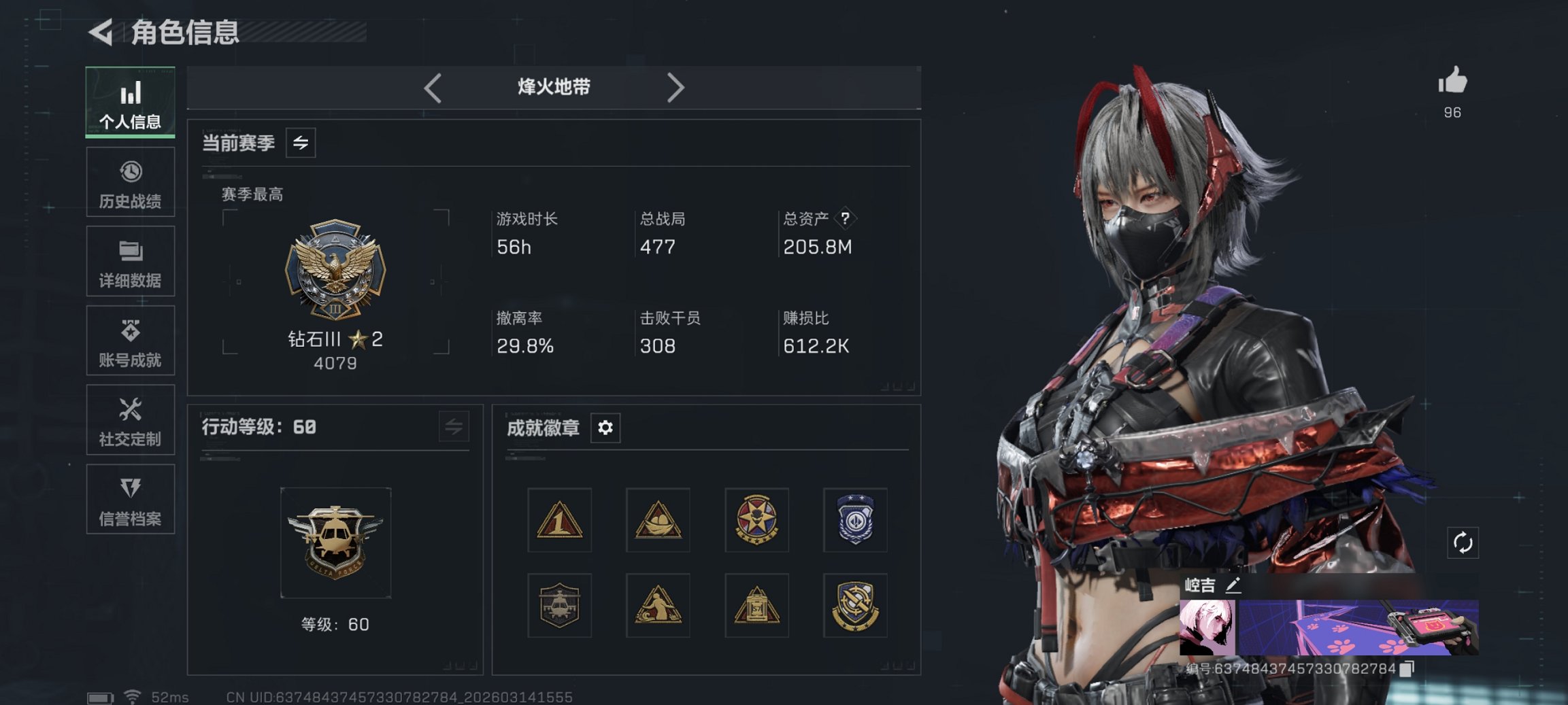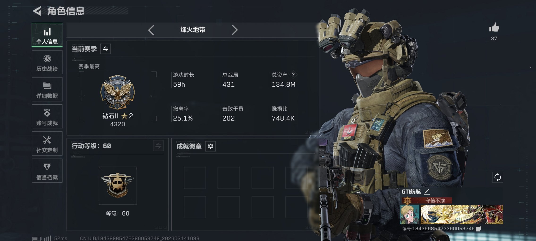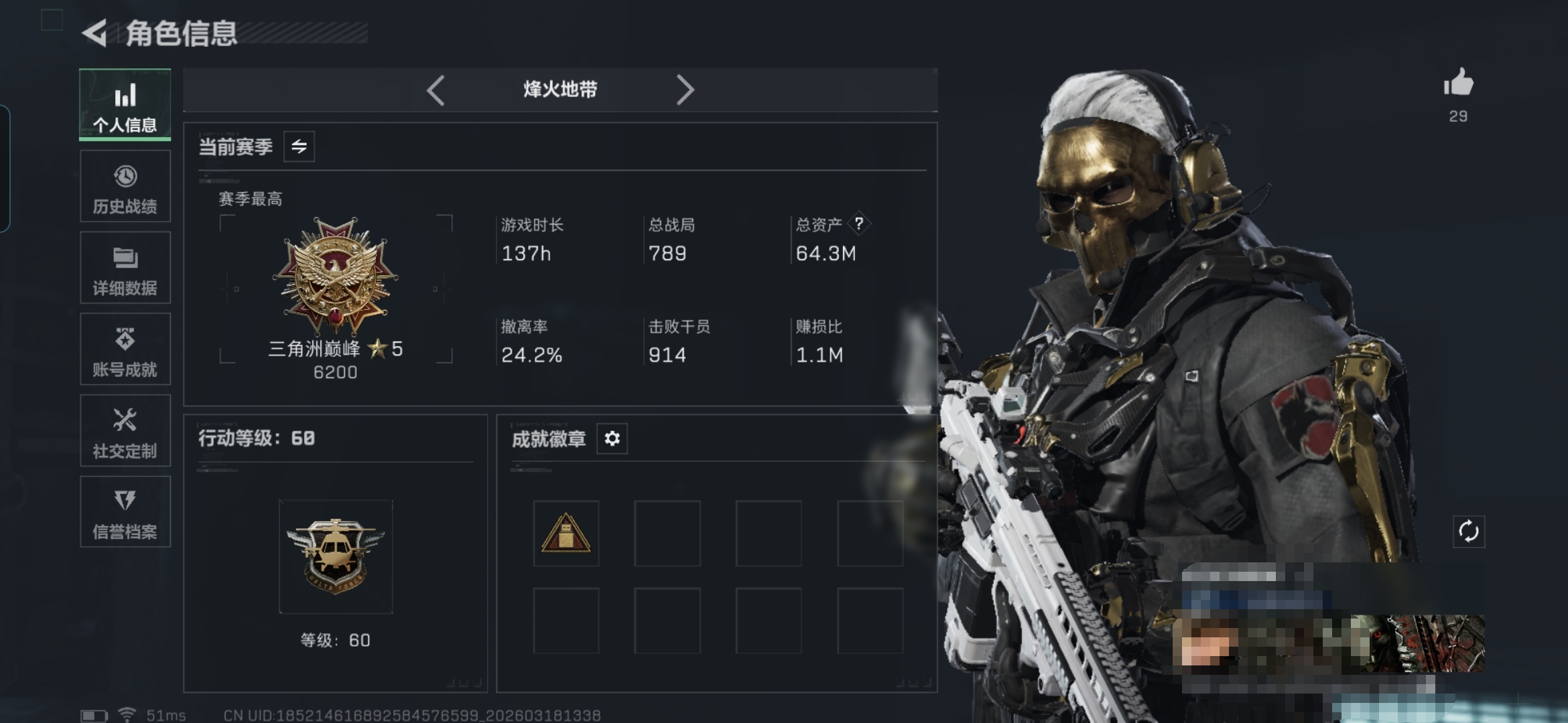 241m总资产-36457k哈夫币-60烽火等级-三角洲巅峰-16战场等级-上等兵