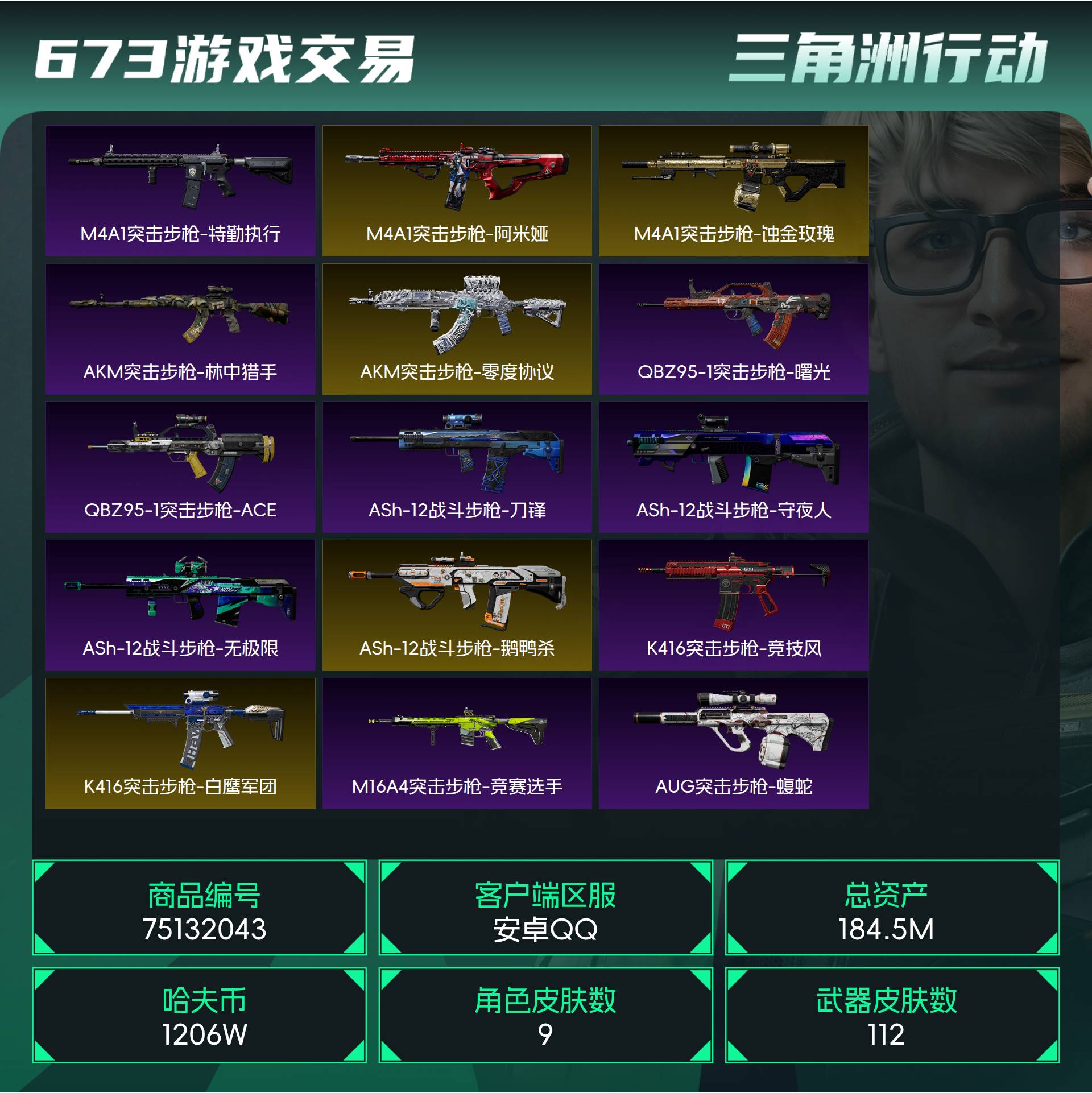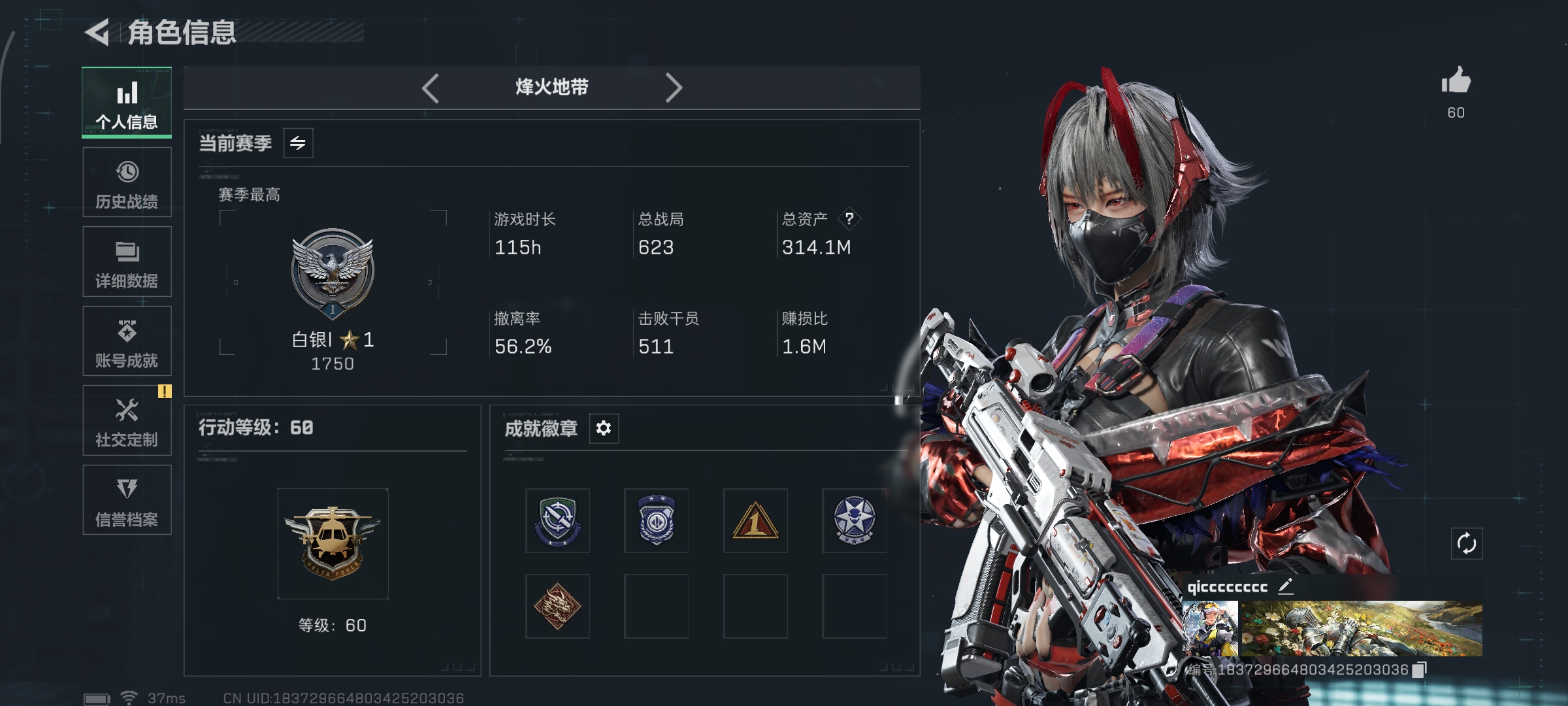 烽火段位黑鹰4 战场段位军士长3 总资产184.5M 哈夫币1206W 干员9 挂饰37 近战5 枪械112 载具56