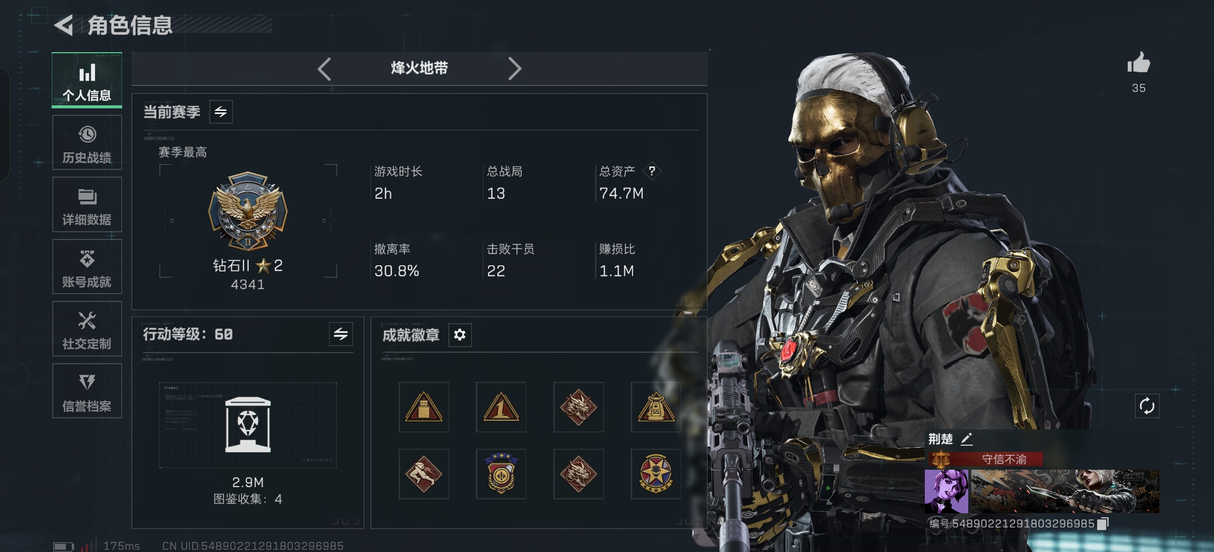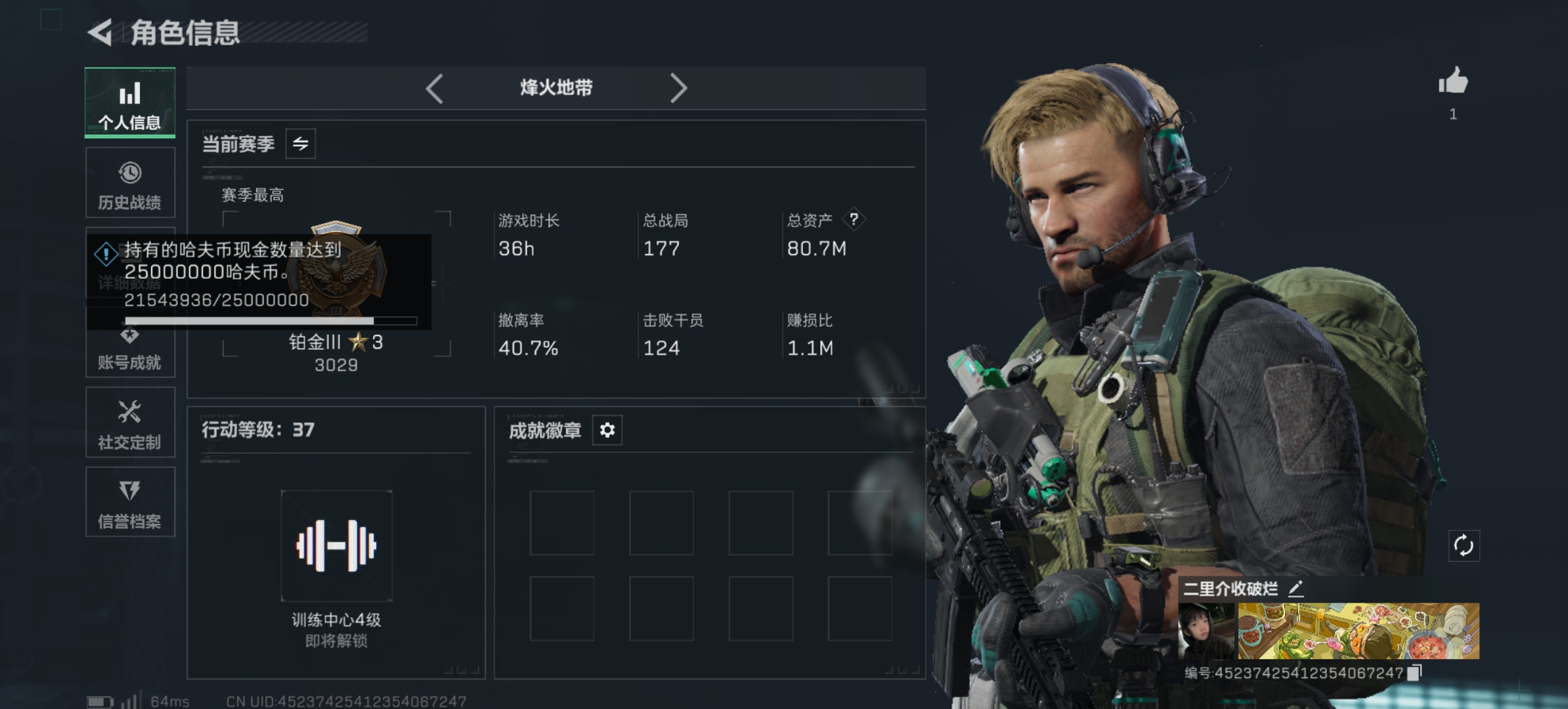 35m总资产-33453k哈伏币-40烽火等级-青铜-1战场等级-无军衔【史