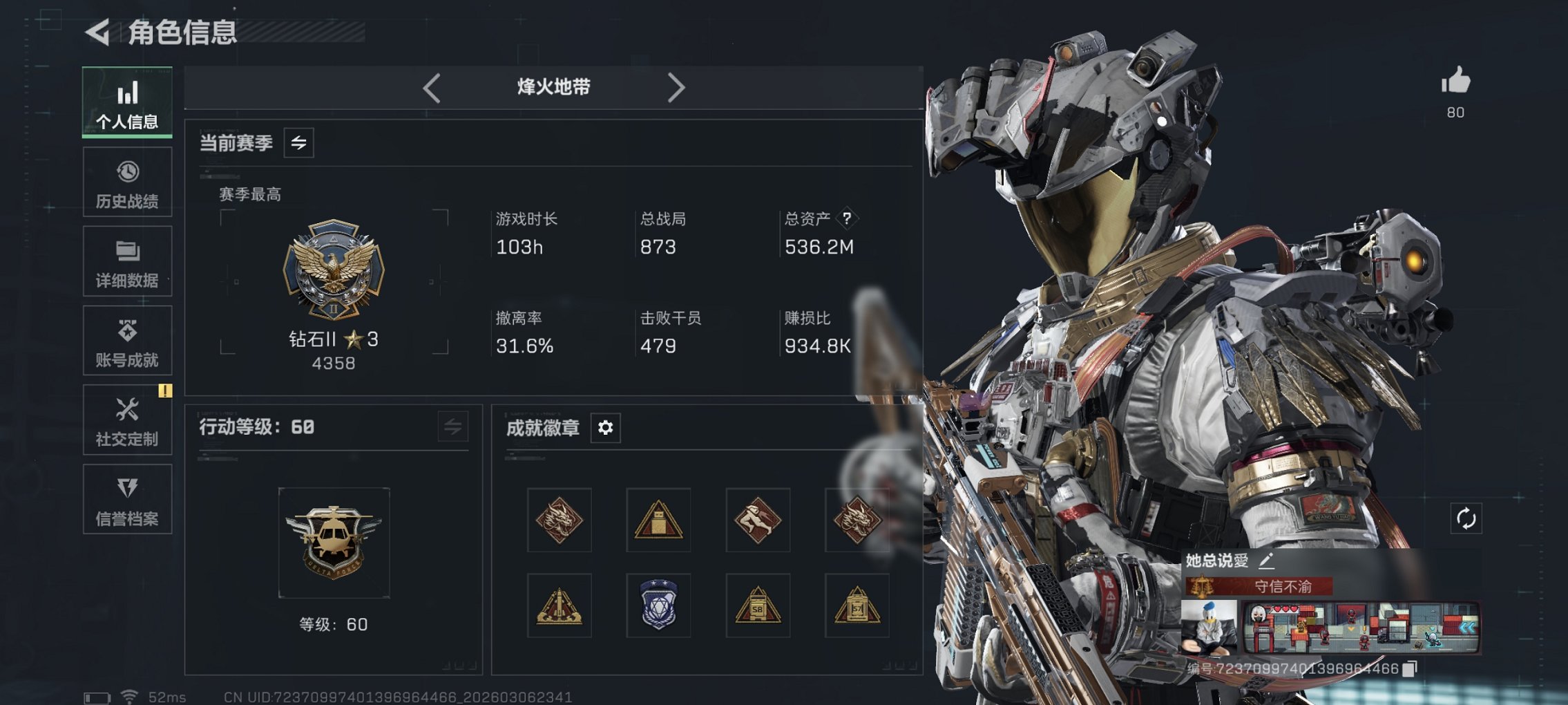 总资产(M):378M/哈夫币(K):59963K/传说枪皮数:31/全面战场等级:40_段位:军士长/烽火地带等级:60_段位:钻石/