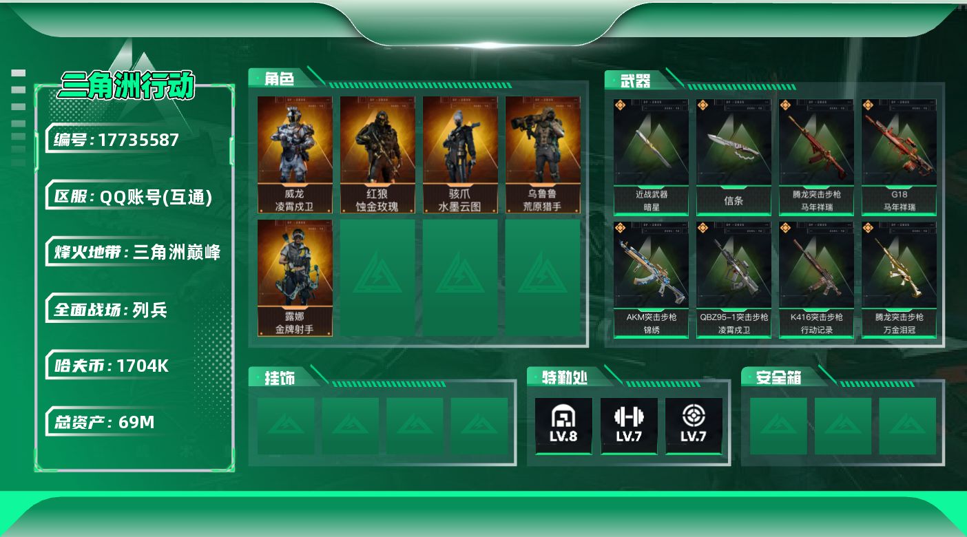 69m总资产-1704k哈夫币-60烽火等级-三角洲巅峰-23战场等级-列兵