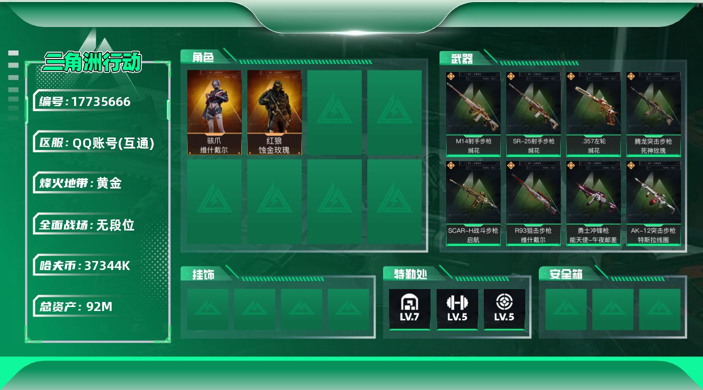 92m总资产-37344k哈夫币-56烽火等级-黄金-5战场等级-无军衔