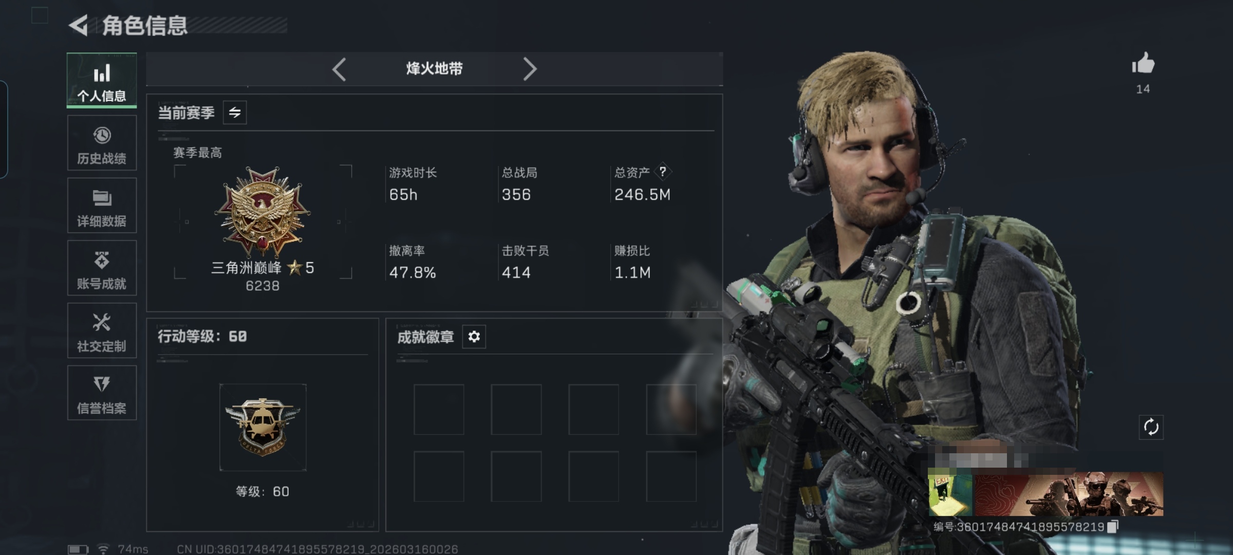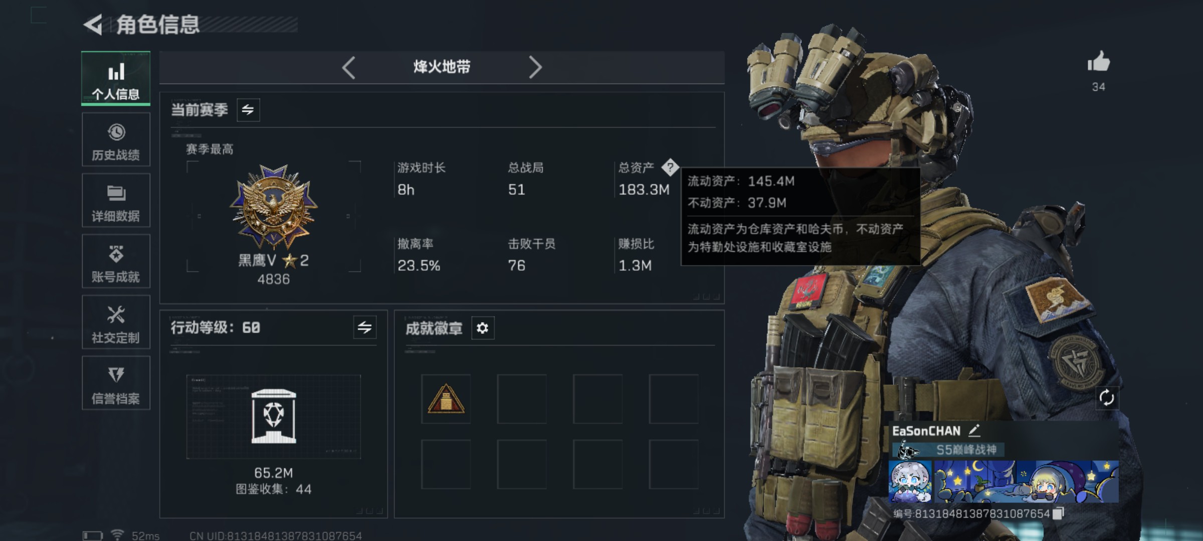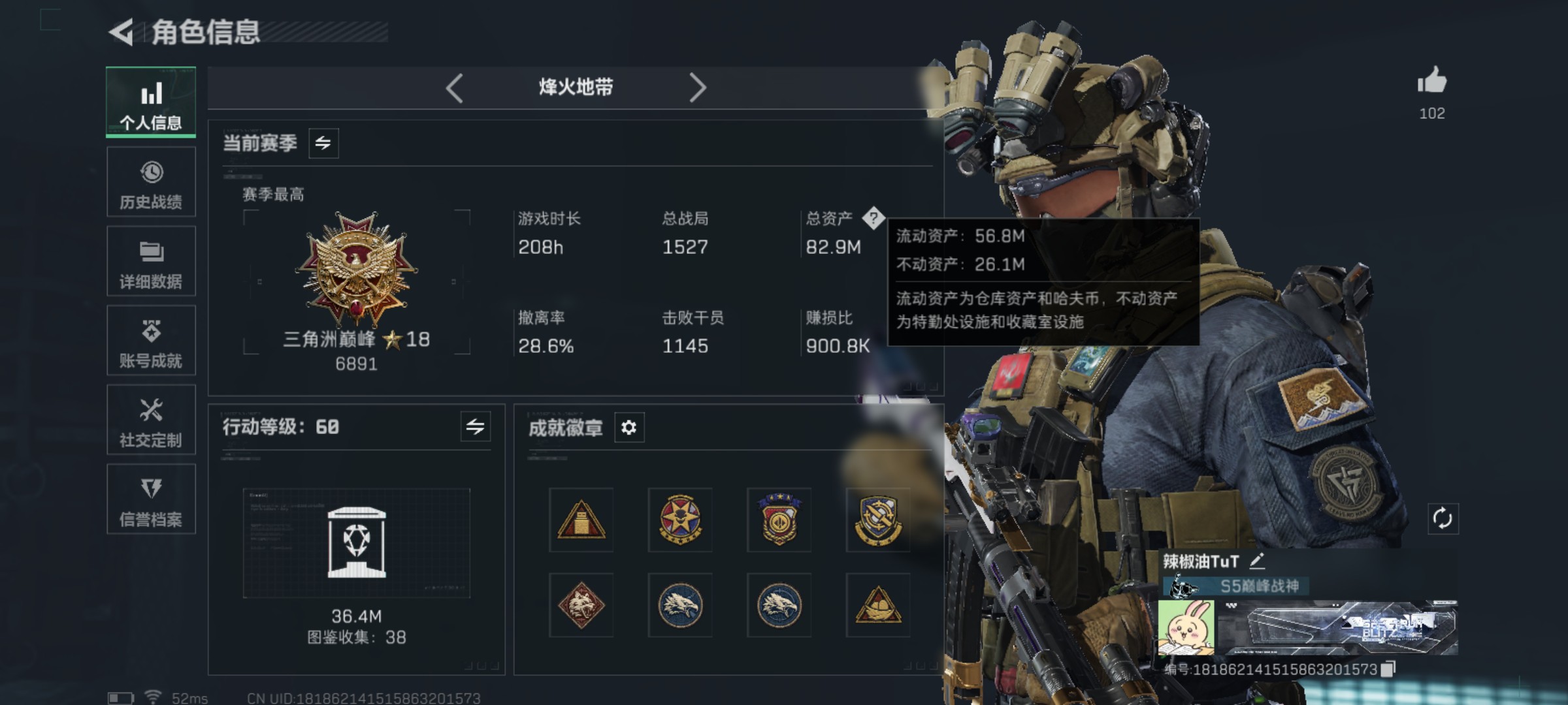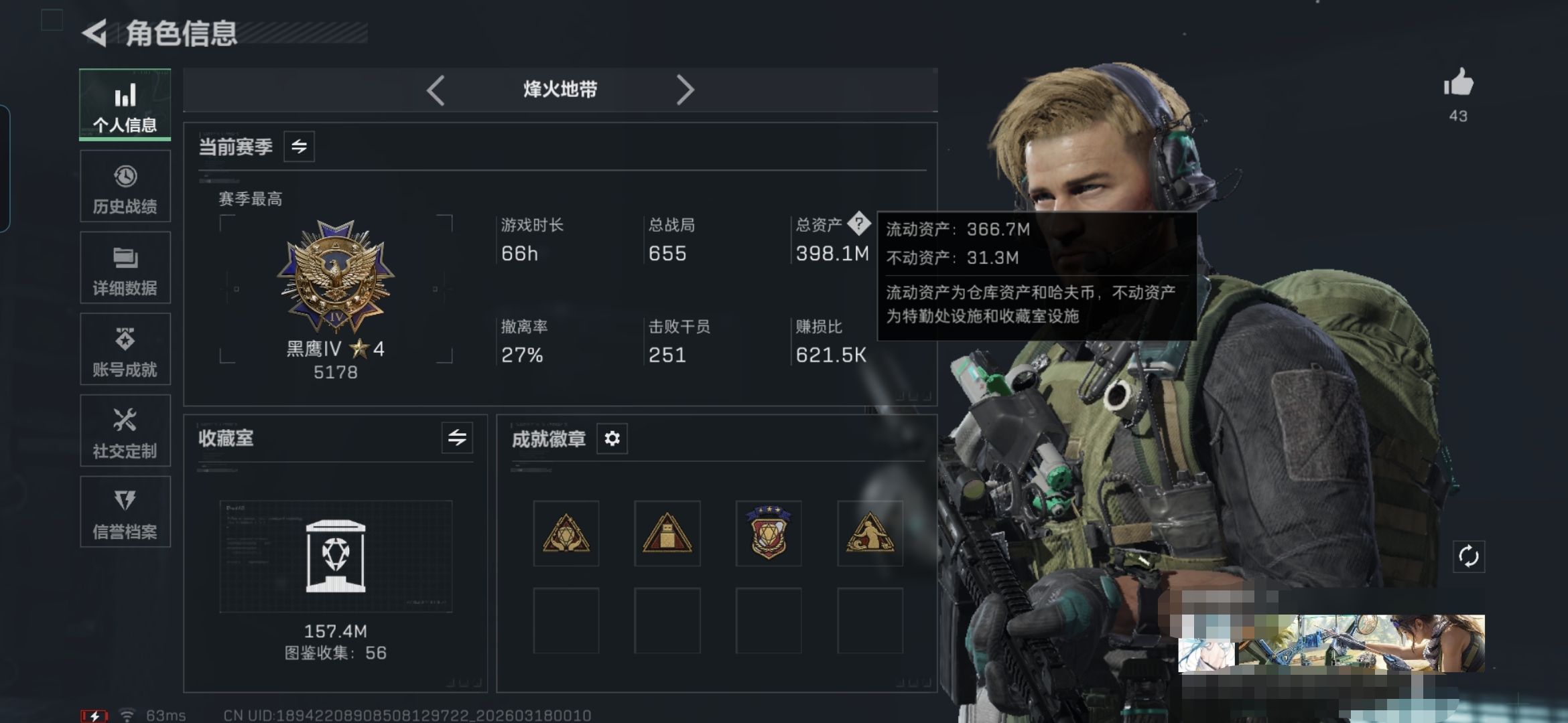 总资产(M):353M/哈夫币(K):37624K/传说枪皮数:22/全面战场等级:22_段位:上等兵/烽火地带等级:60_段位:黑鹰