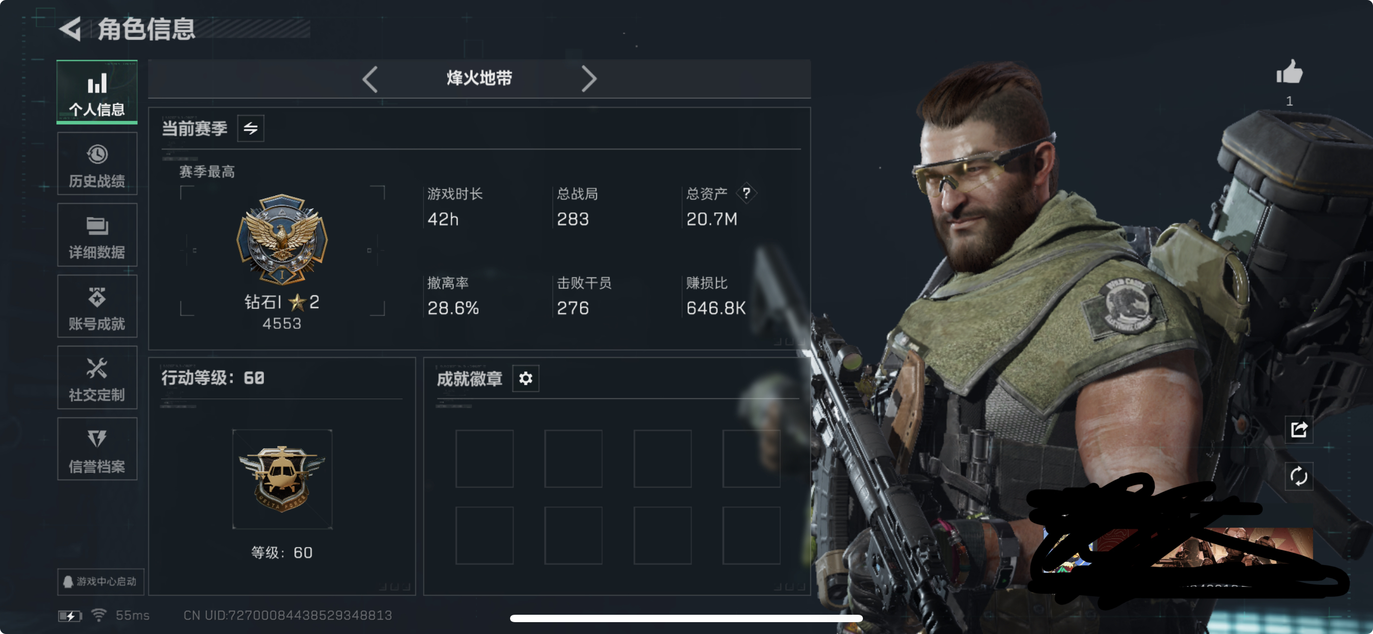 36m总资产-61k哈伏币-60烽火等级-钻石-47战场等级-军士长【干员外