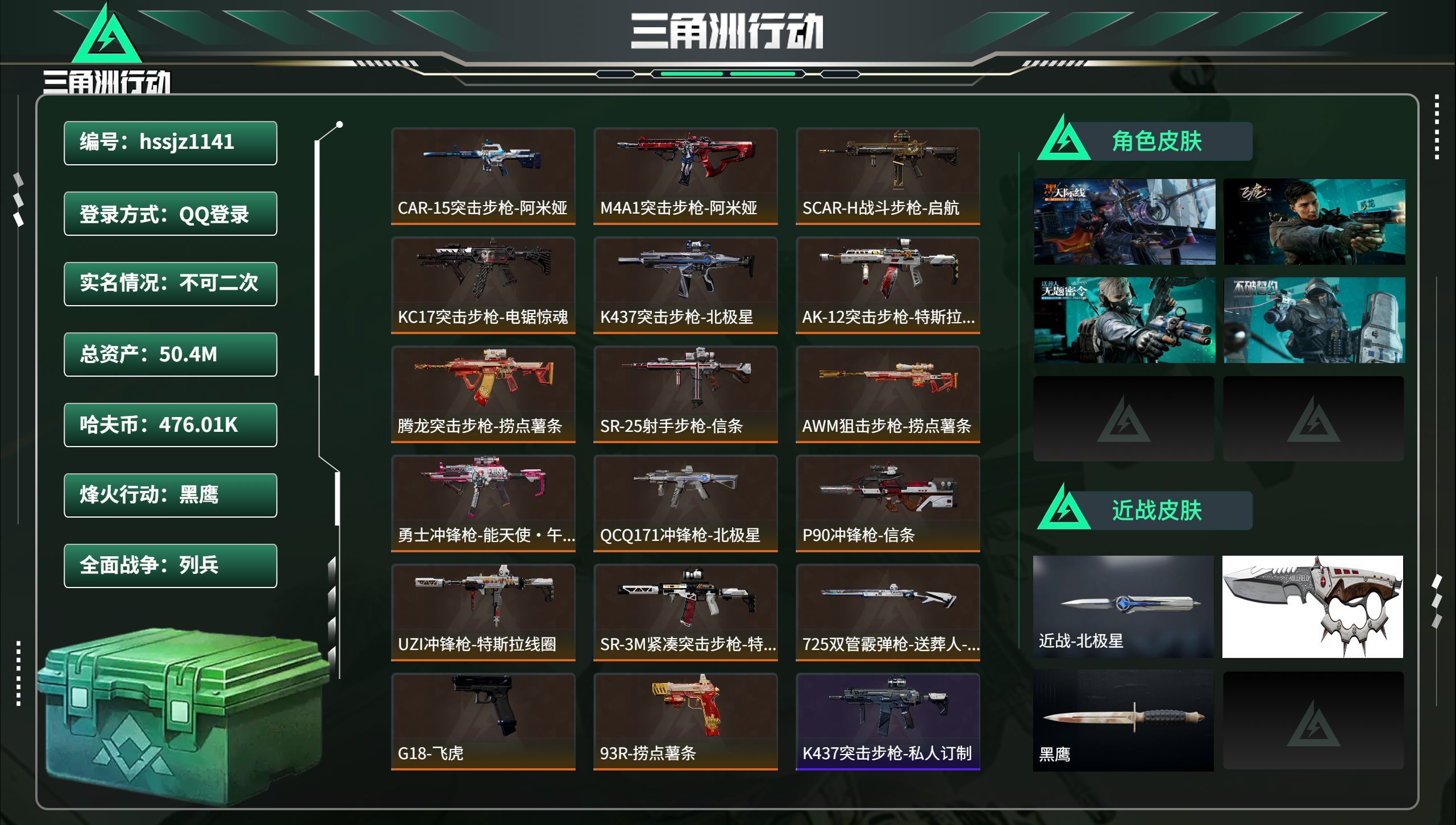 总资产50.4M,哈夫币 476.01K,战场等级:11 列兵,行动等级:60 黑鹰,角色皮肤4,枪