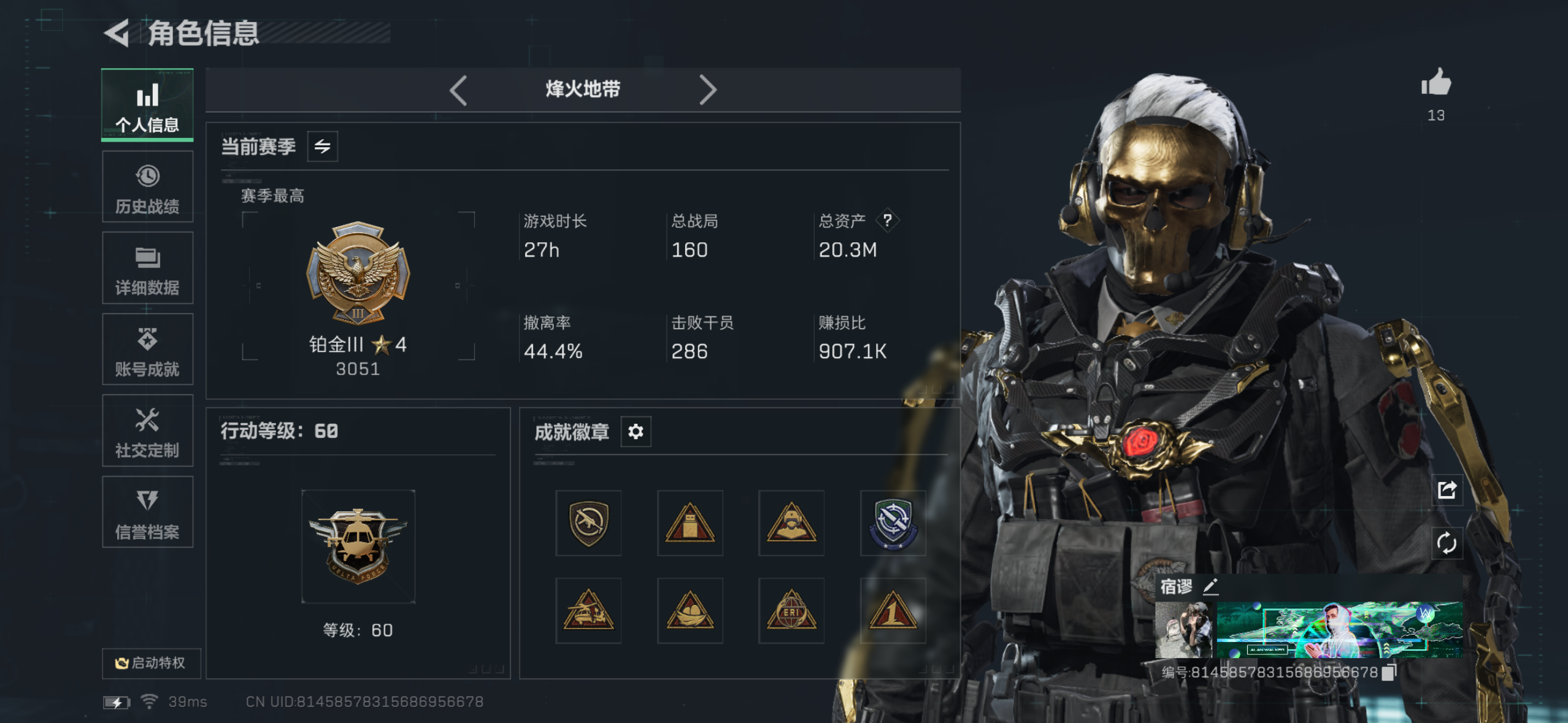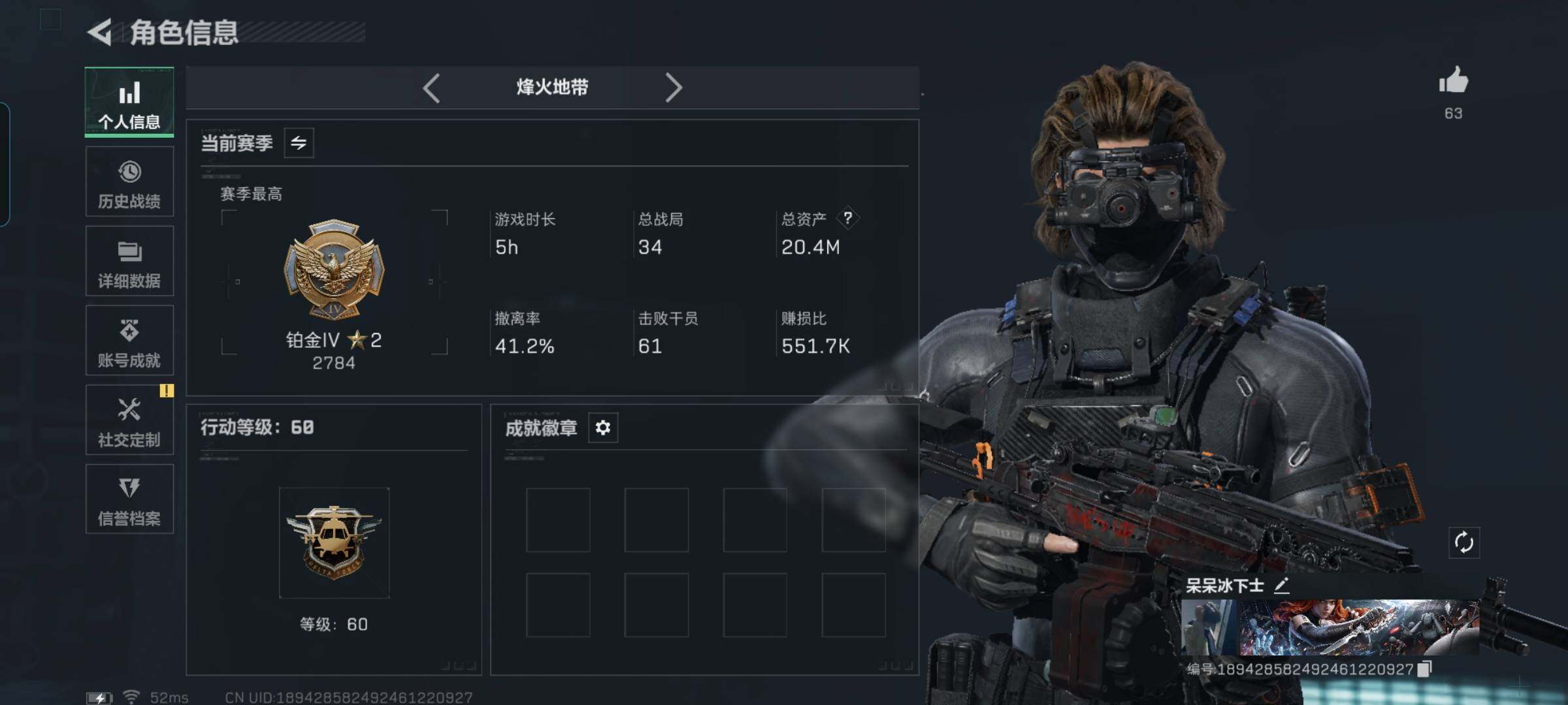 总资产(M):51M/哈夫币(K):87K/传说枪皮数:1/全面战场等级:1_段位:无段位/烽火地带等级:60_段位:钻石