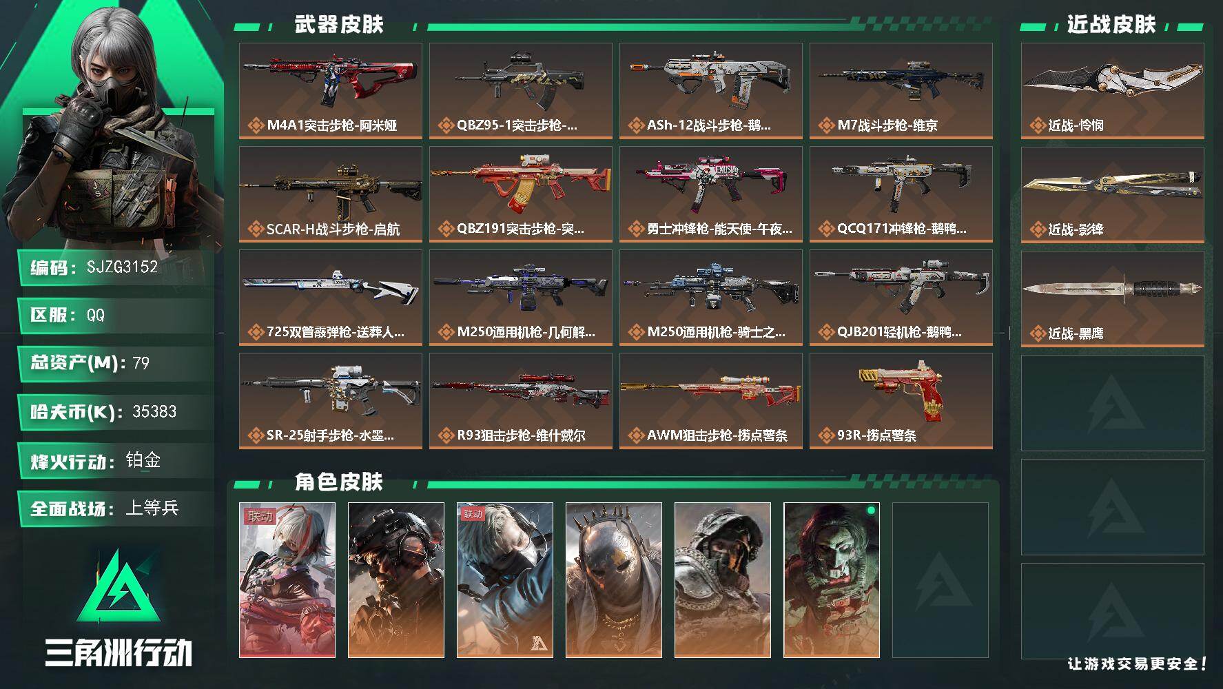 总资产(M):79M/哈夫币(K):35383K/传说枪皮数:16/全面战场等级:29_段位:上等兵/烽火地带等级:60_段位:铂金