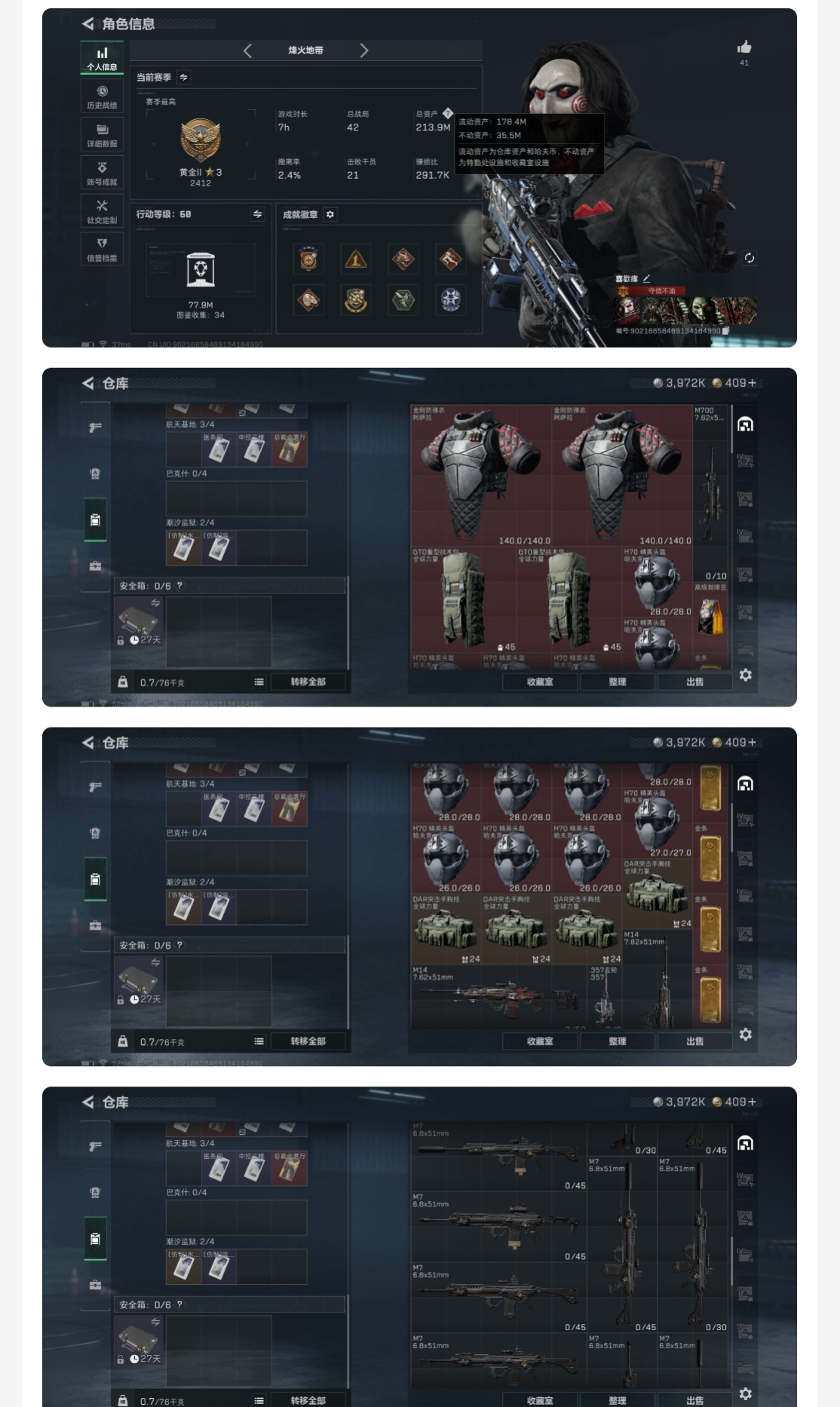 总资产(M):34M/哈夫币(K):5244K/传说枪皮数:7/全面战场等级:14_段位:列兵/烽火地带等级:60_段位:钻石