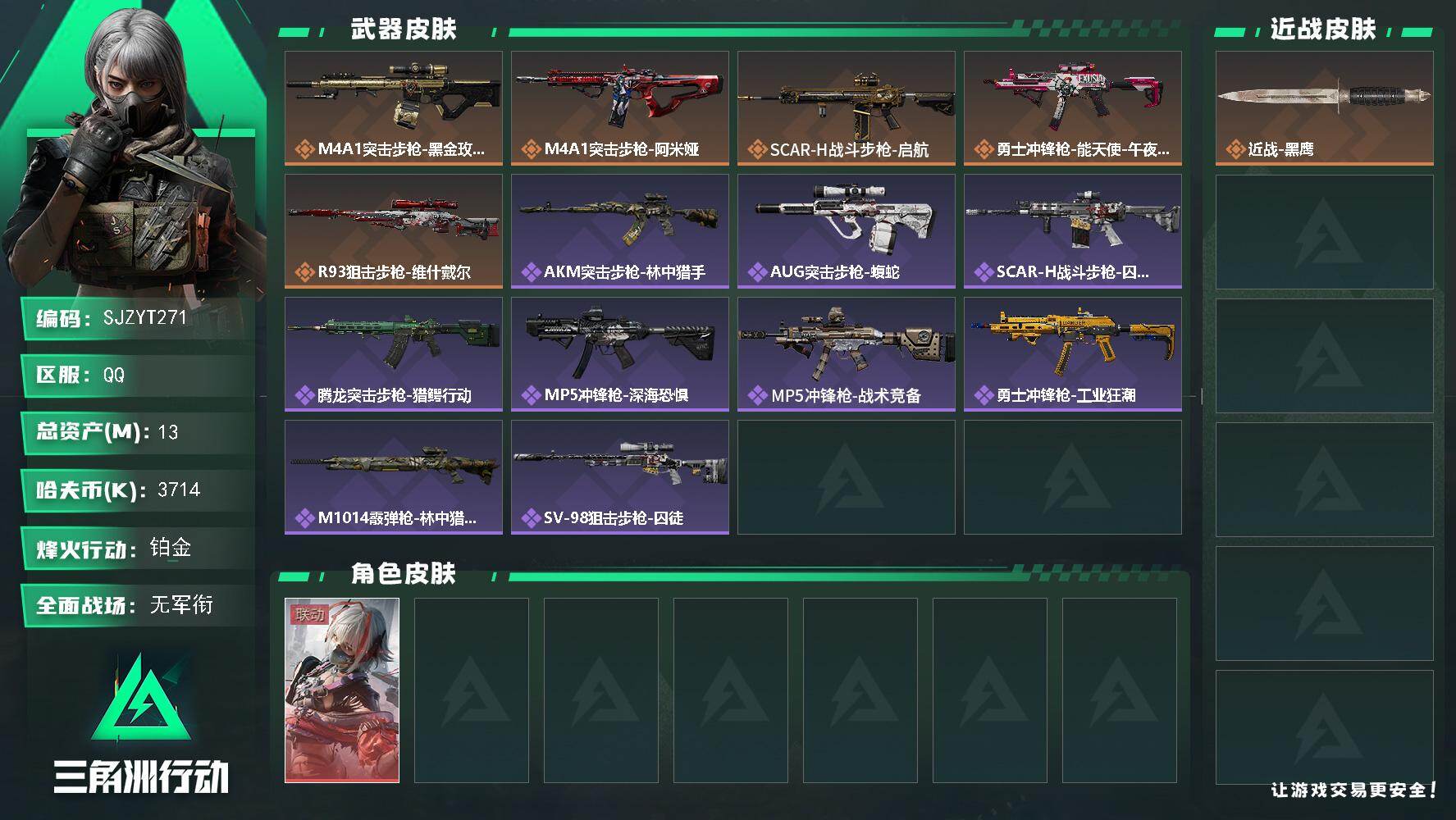 总资产(M):13M/哈夫币(K):3714K/传说枪皮数:5/全面战场等级:1_段位:无段位/烽火地带等级:33_段位:铂金