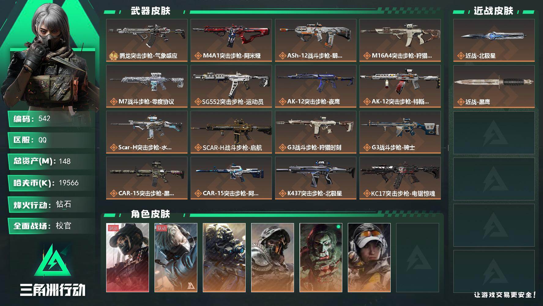 总资产(M):217M/哈夫币(K):2102K/传说枪皮数:23/全面战场等级:24_段位:列兵/烽火地带等级:60_段位:黑鹰/
