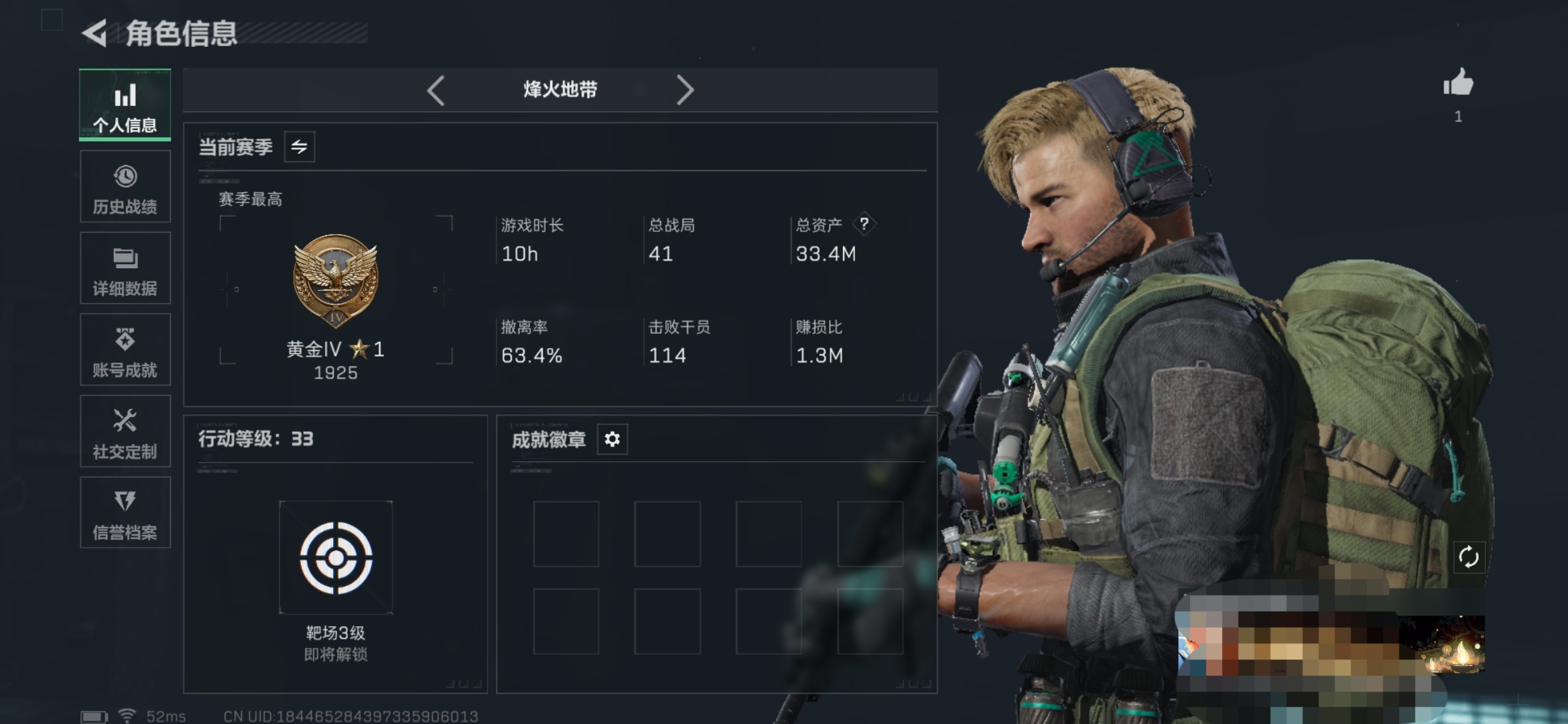 总资产(M):13M/哈夫币(K):3714K/传说枪皮数:5/全面战场等级:1_段位:无段位/烽火地带等级:33_段位:铂金