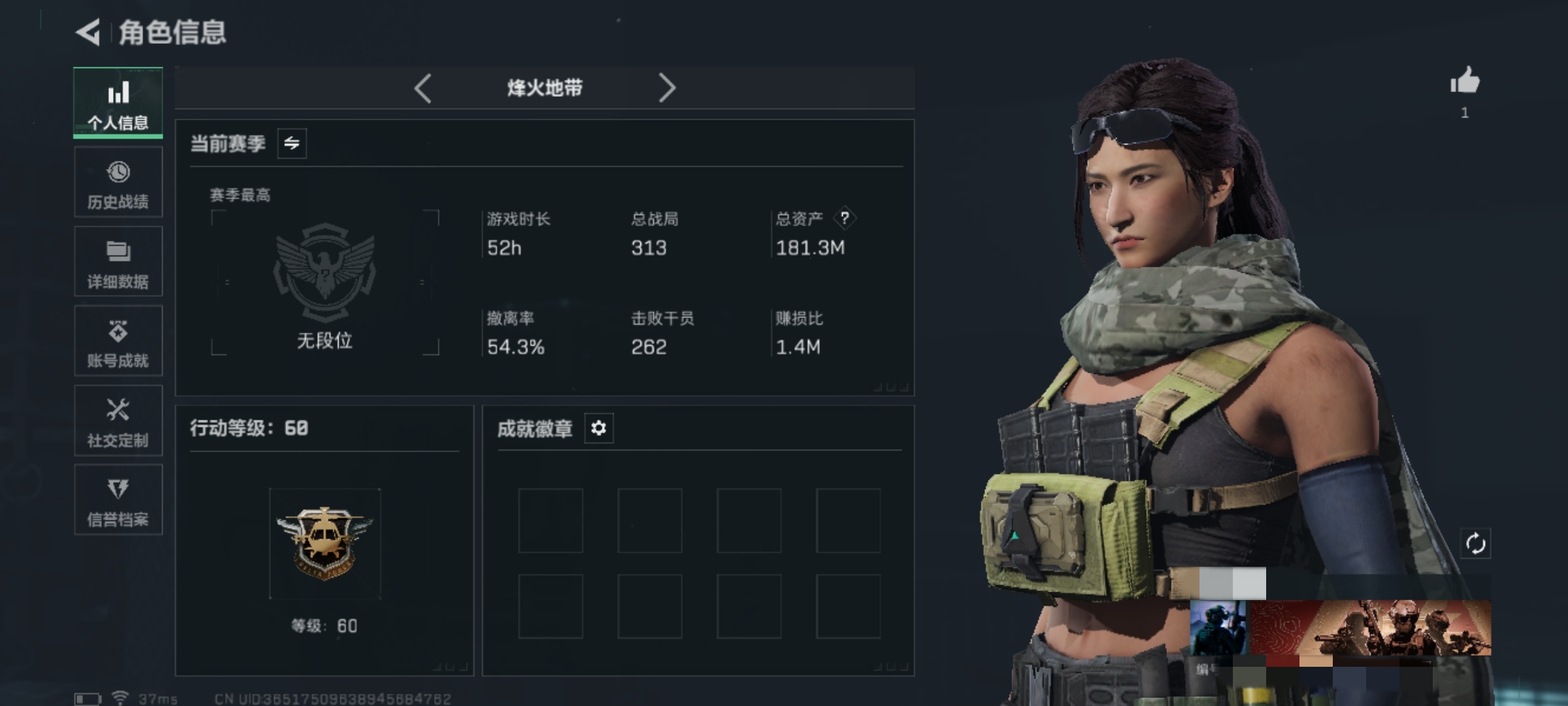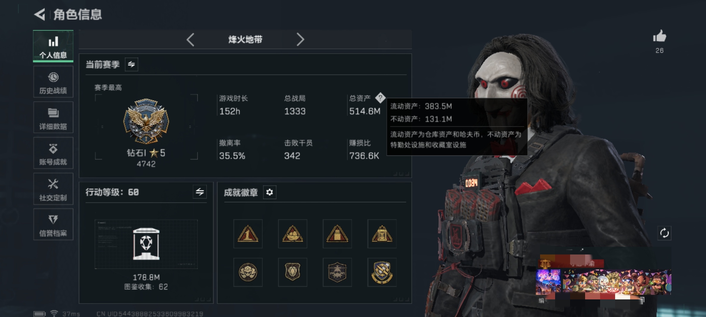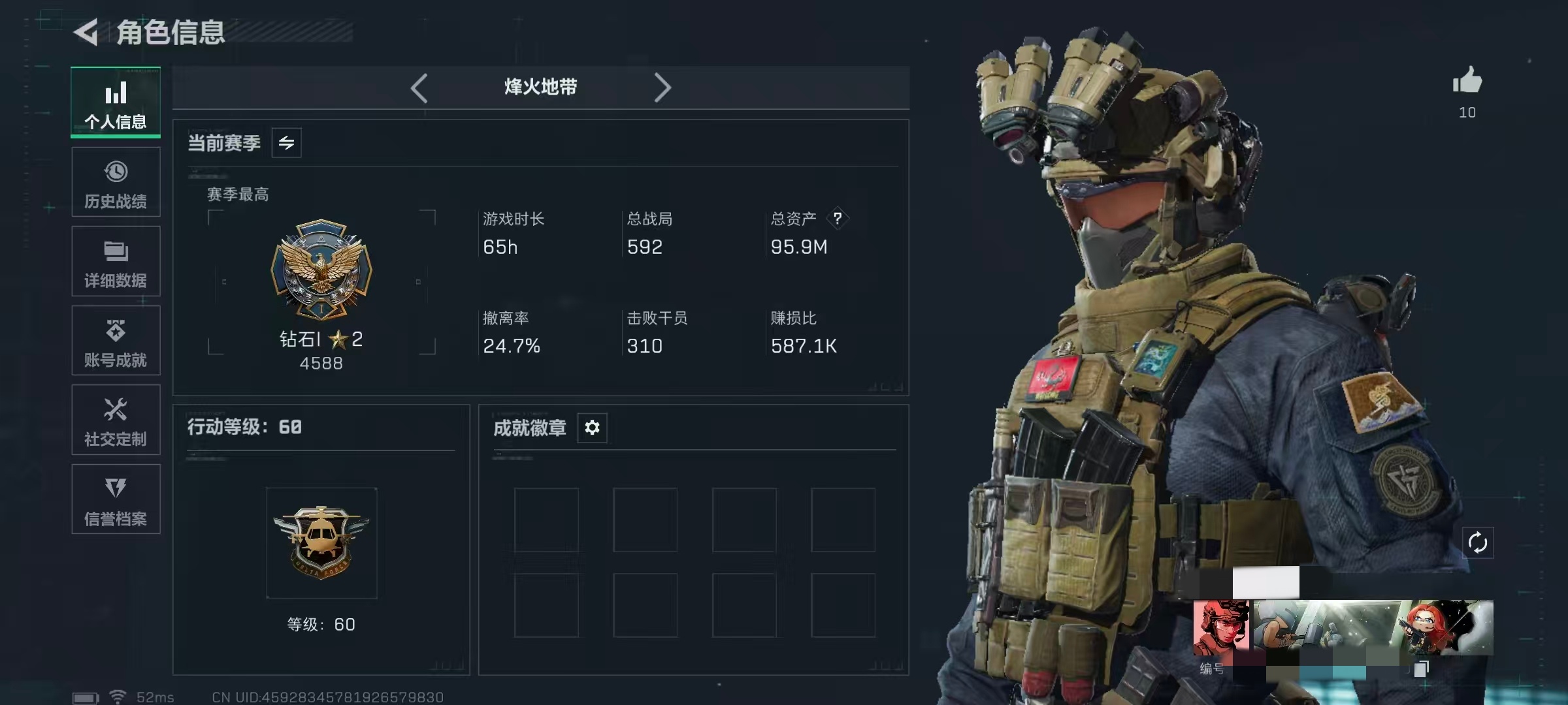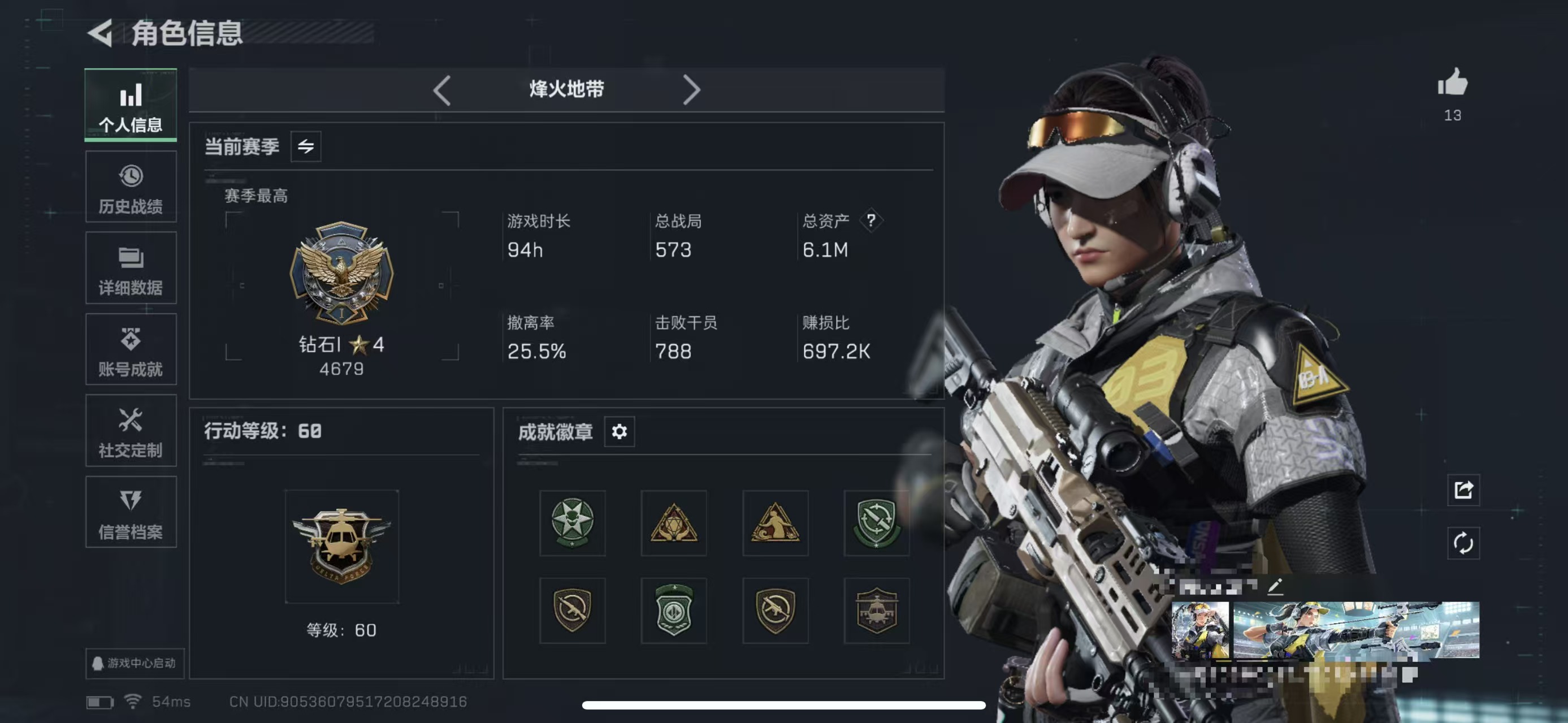 总资产(M):113M/哈夫币(K):10082K/全面战场等级:17_段位:上等兵/烽火地带等级:60_段位:铂金/