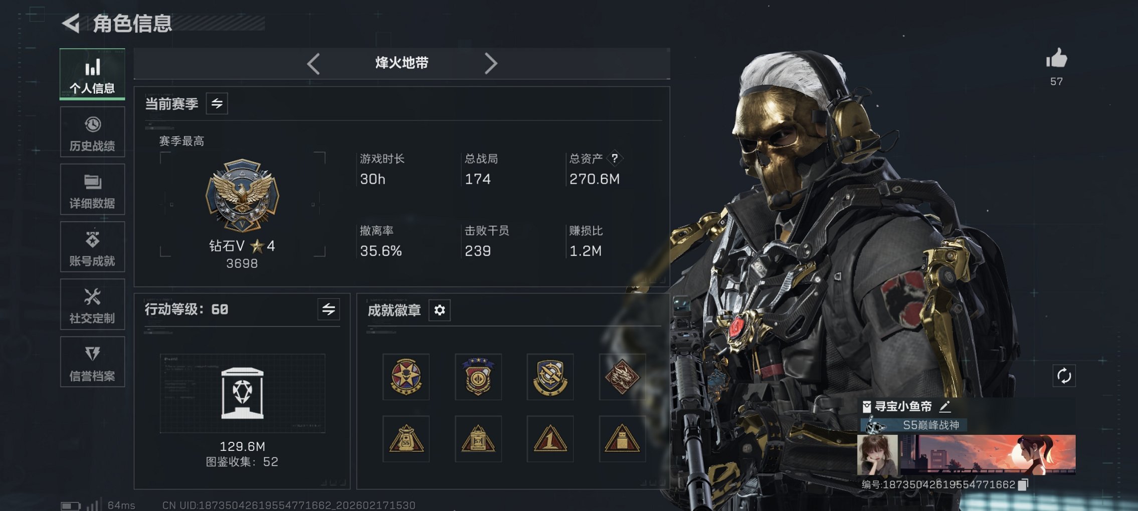 烽火段位铂金3 战场段位暂无段位 总资产144.9M 哈夫币2237W 干员1 挂饰18 近战2 枪械97 载具10