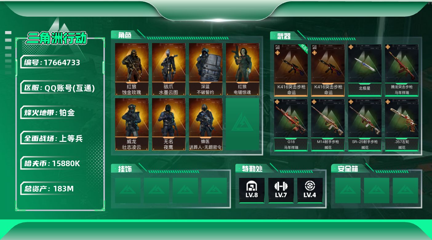 183m总资产-15880k哈伏币-60烽火等级-铂金-50战场等级-上等兵