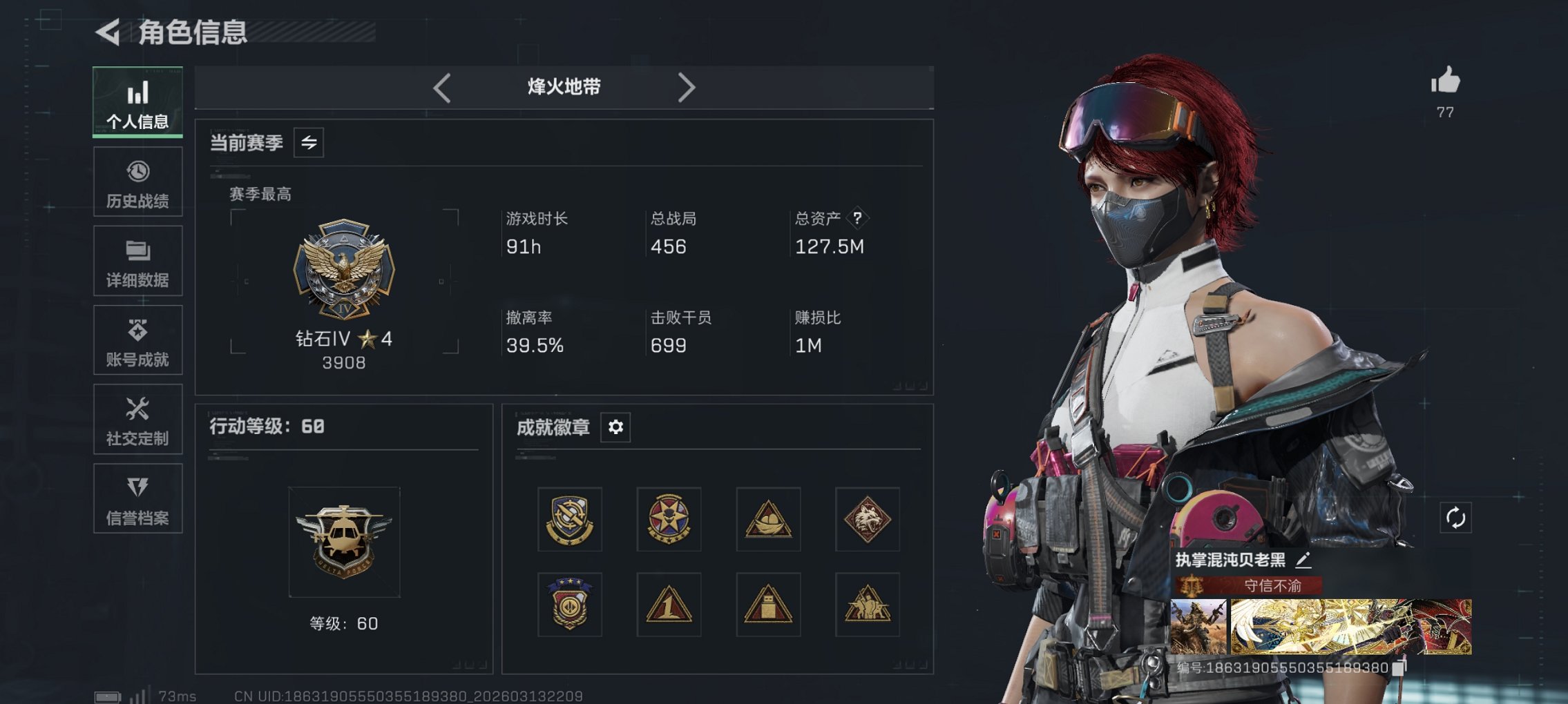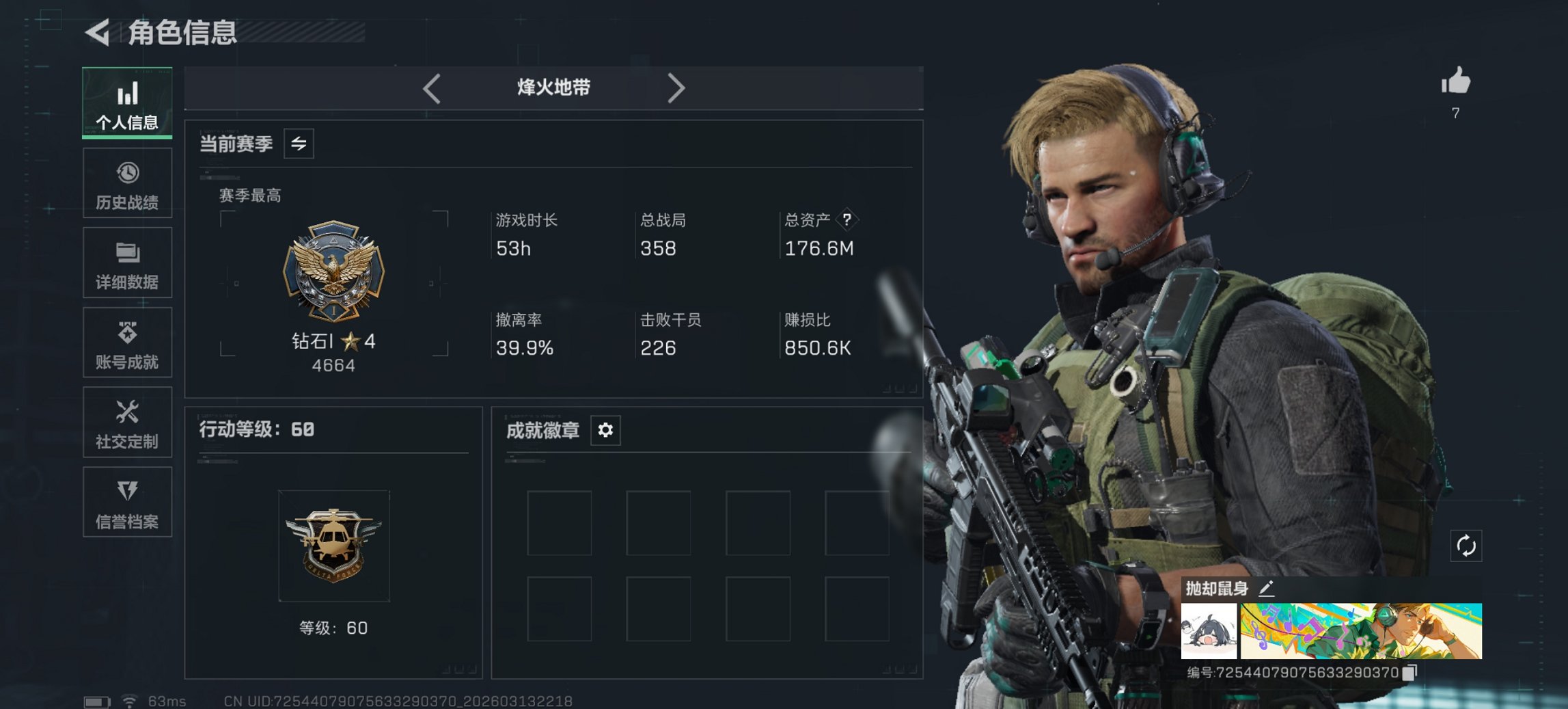 195m总资产-855k哈伏币-60烽火等级-三角洲巅峰-18战场等级-列兵