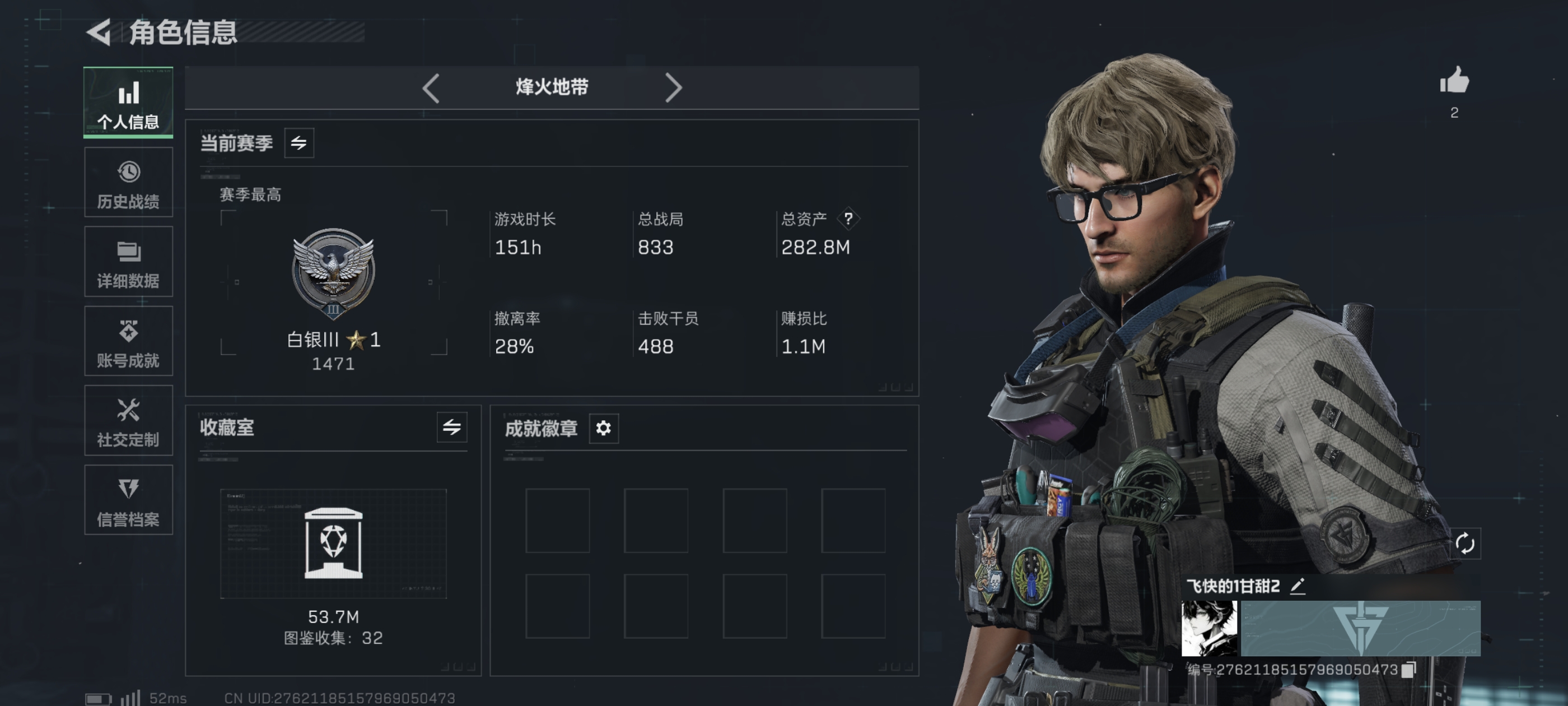 总资产(M):53M/哈夫币(K):100K/传说枪皮数:23/全面战场等级:50_段位:上等兵/烽火地带等级:60_段位:黑鹰/