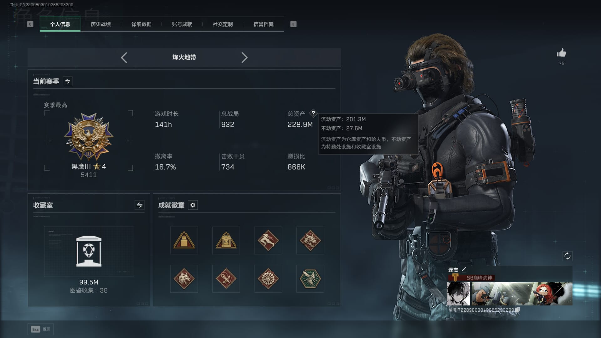总资产(M):193M/哈夫币(K):2686K/传说枪皮数:25/全面战场等级:25_段位:上等兵/烽火地带等级:60_段位:黄金/