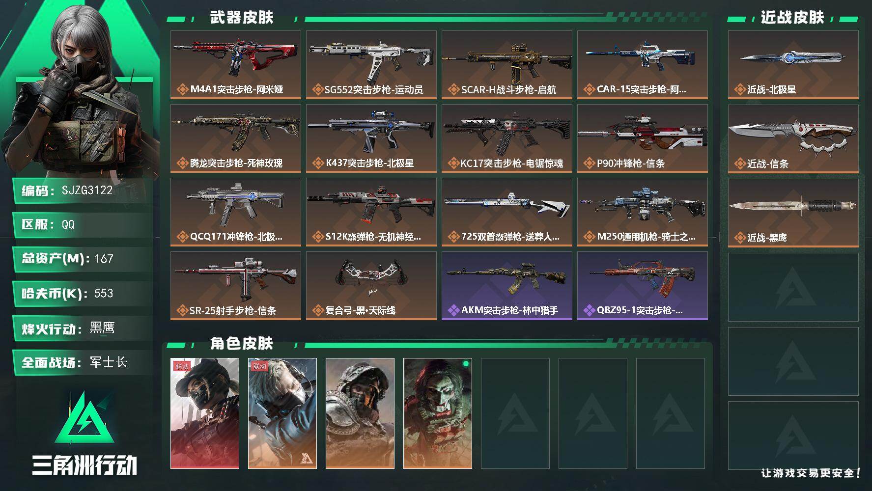 总资产(M):167M/哈夫币(K):553K/传说枪皮数:14/全面战场等级:25_段位:军士长/烽火地带等级:60_段位:黑鹰/
