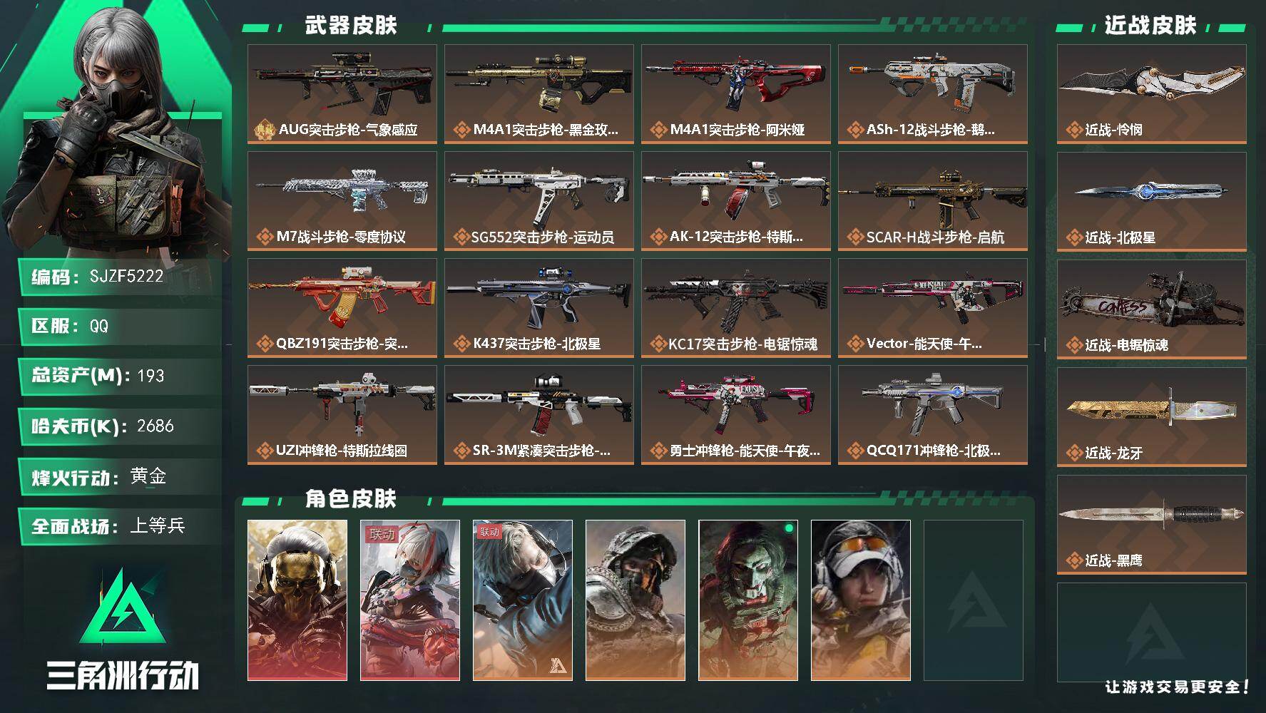 总资产(M):193M/哈夫币(K):2686K/传说枪皮数:25/全面战场等级:25_段位:上等兵/烽火地带等级:60_段位:黄金/