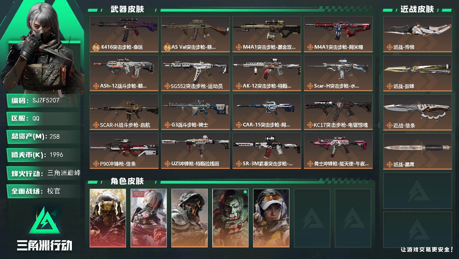 总资产(M):258M/哈夫币(K):1996K/传说枪皮数:21/全面战场等级:47_段位:校官/烽火地带等级:60_段位:三角洲巅峰/