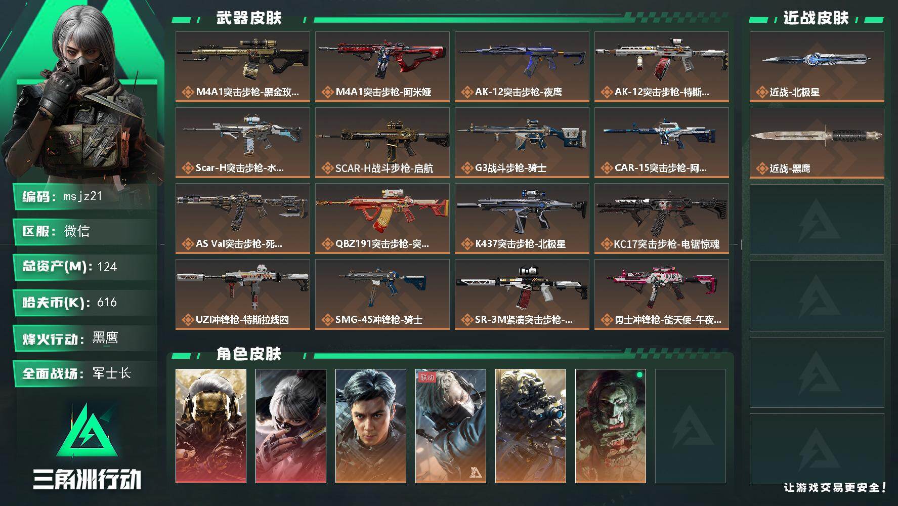 124m总资产-616k哈伏币-60烽火等级-黑鹰-50战场等级-军士长【干