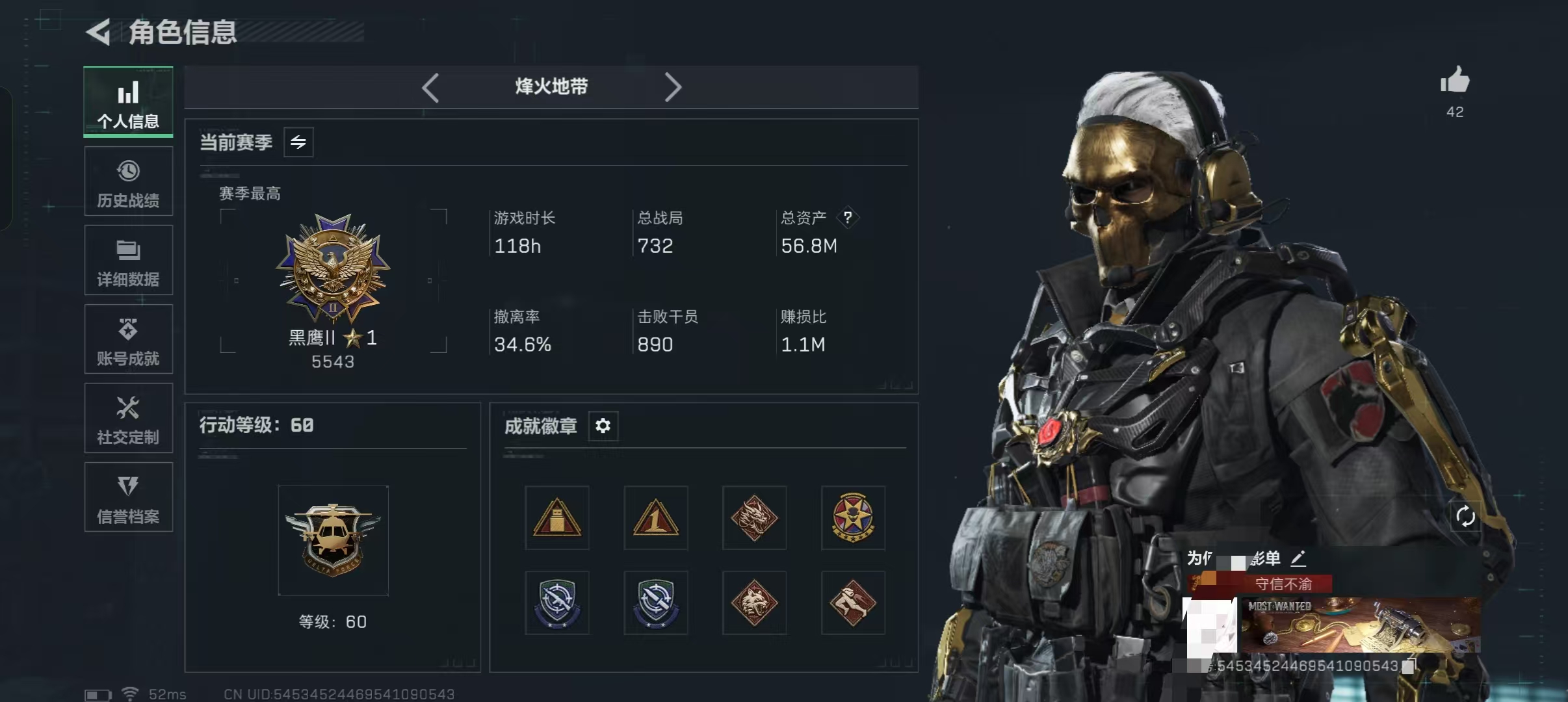 125m总资产-1530k哈夫币-60烽火等级-黑鹰-24战场等级-军士长