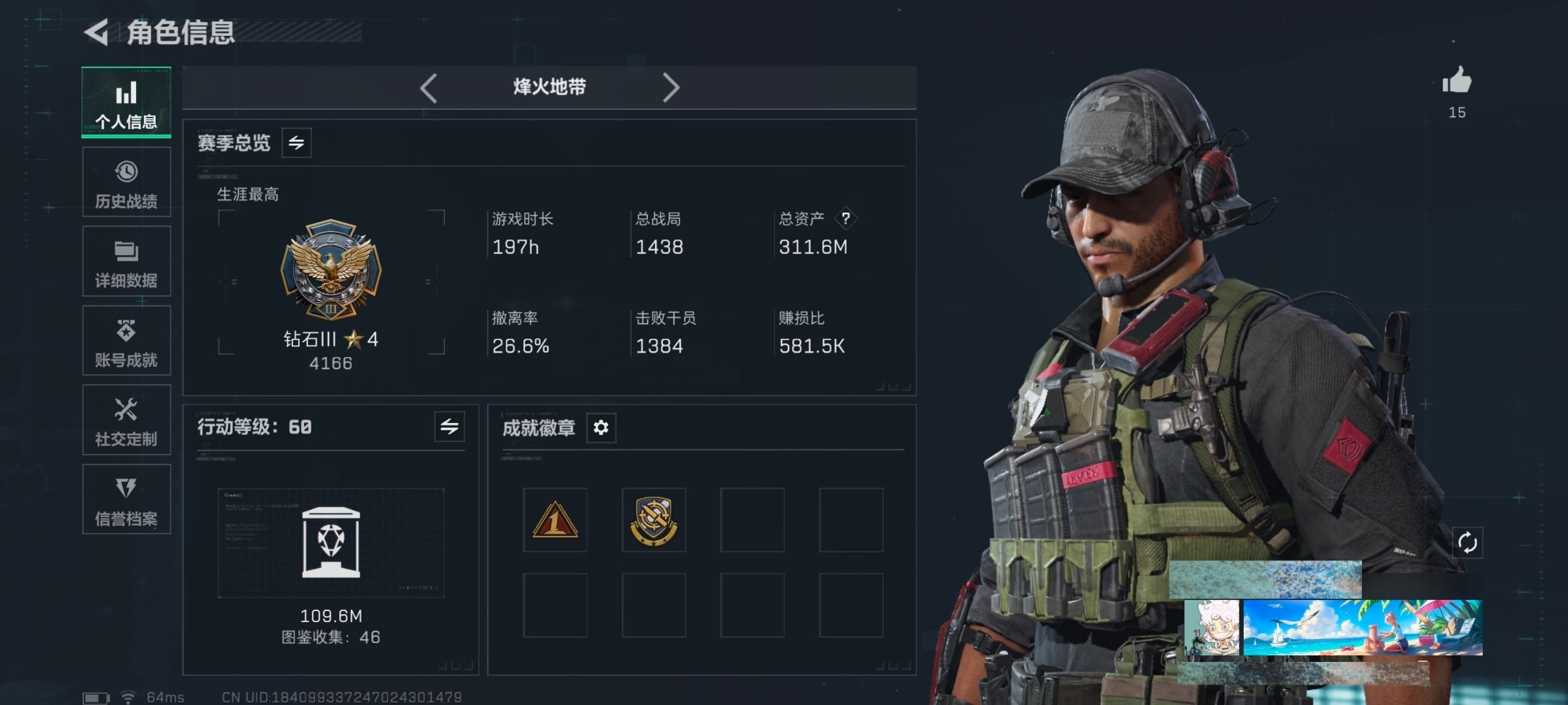 总资产(M):322M/哈夫币(K):111340K/传说枪皮数:15/全面战场等级:35_段位:尉官/烽火地带等级:60_段位:钻石