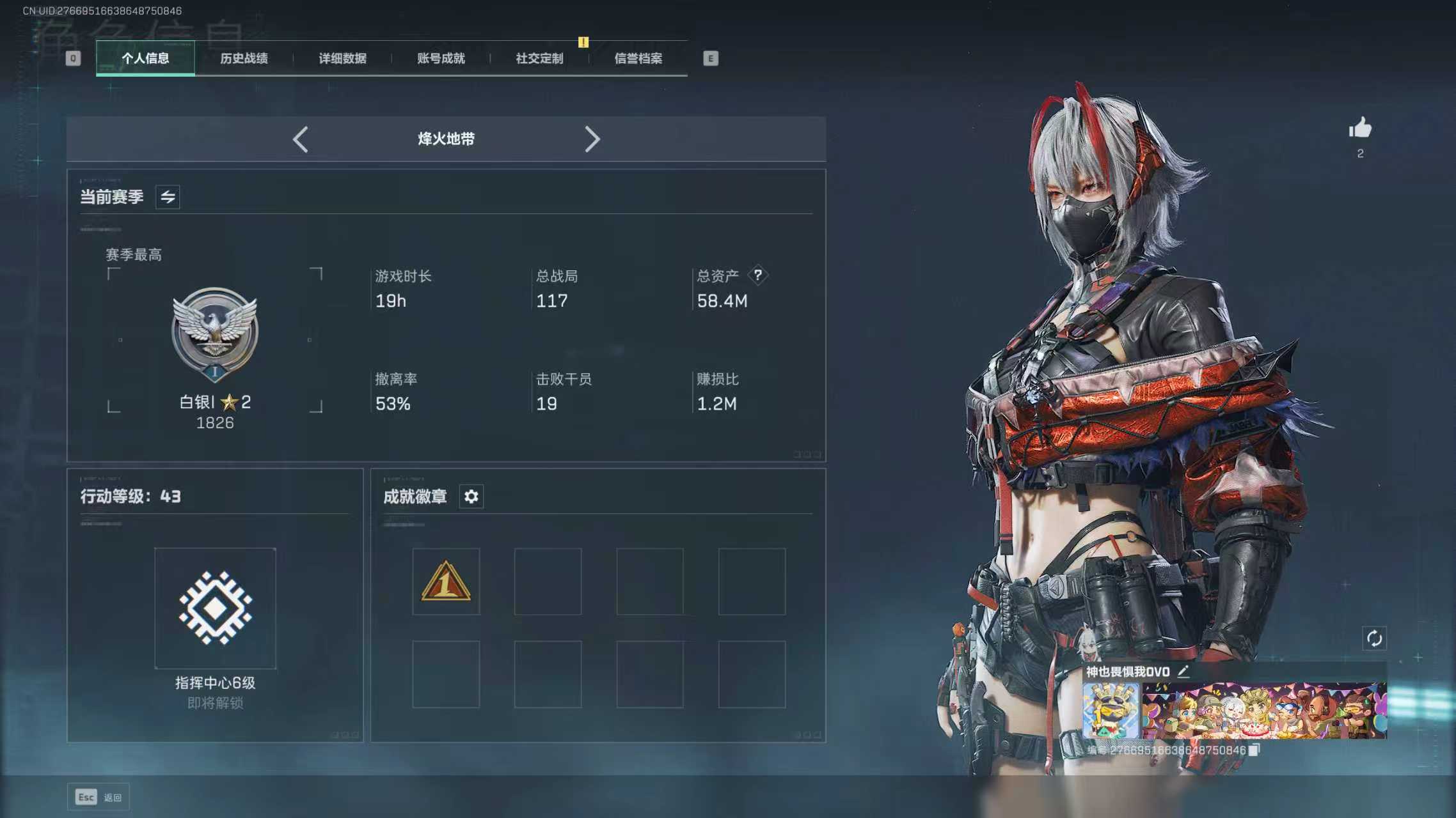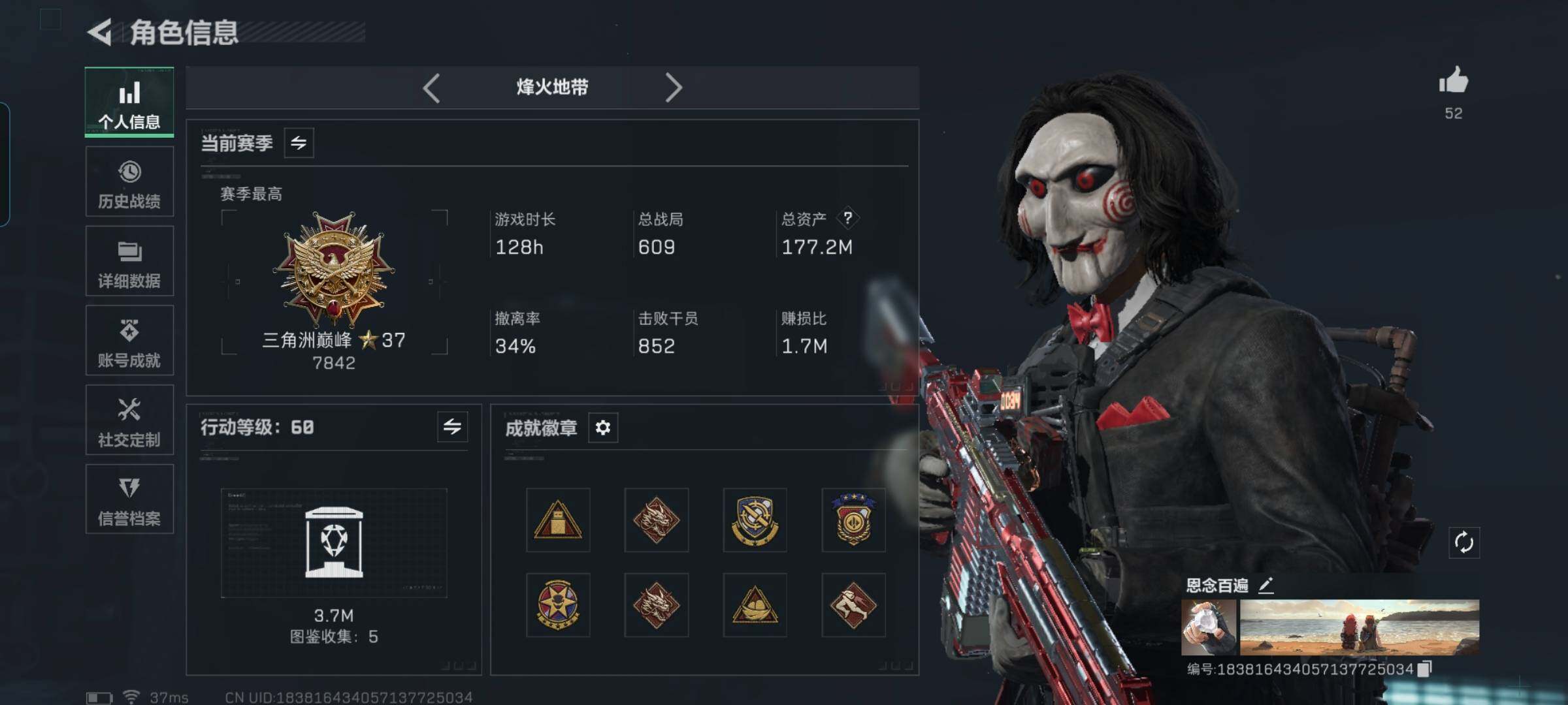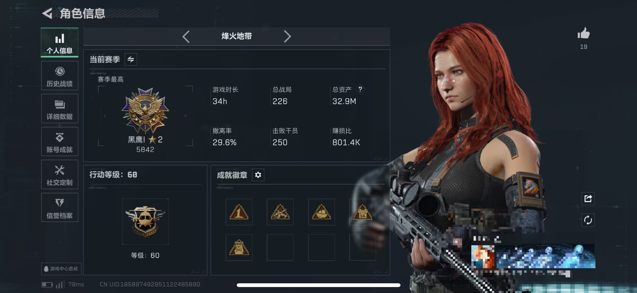 10m总资产-34k哈伏币-60烽火等级-铂金-42战场等级-上等兵【干员外
