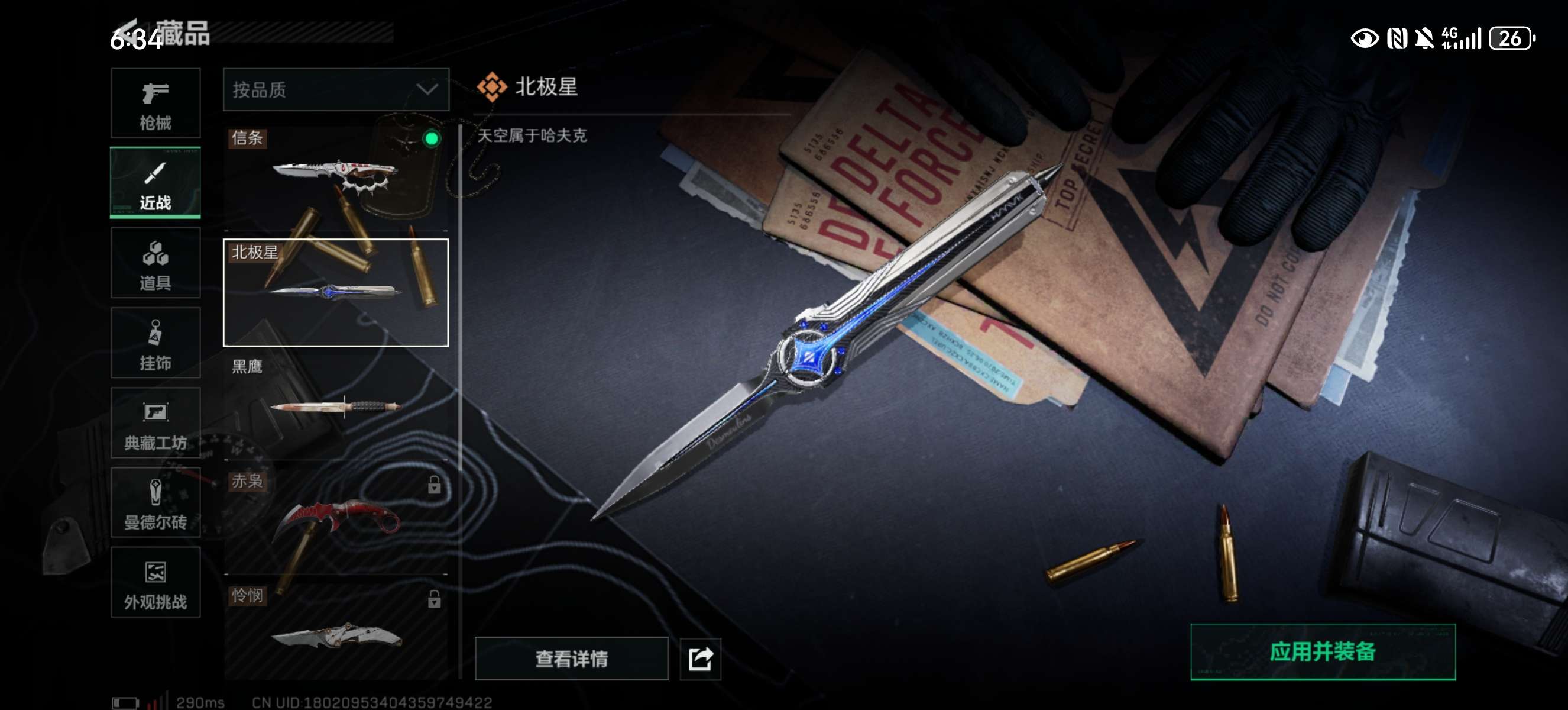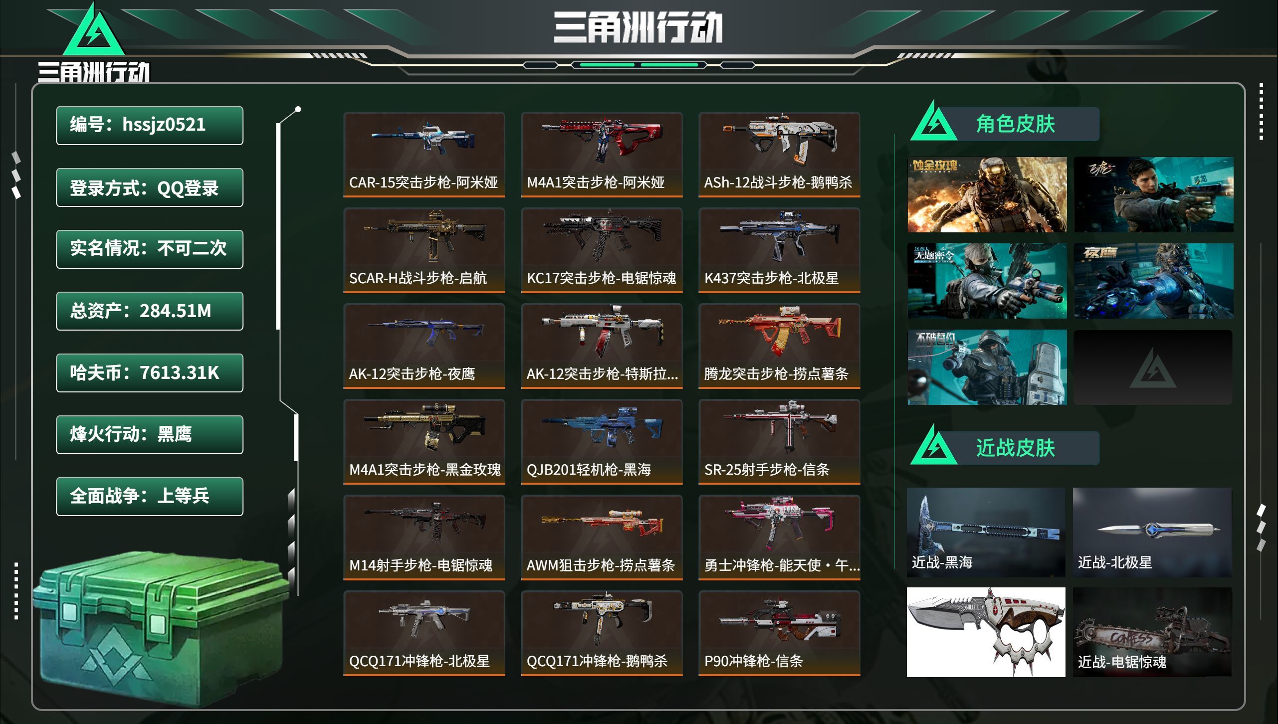 总资产284.51M,哈夫币 7613.31K,战场等级:26 上等兵,行动等级:60 黑鹰,角色皮