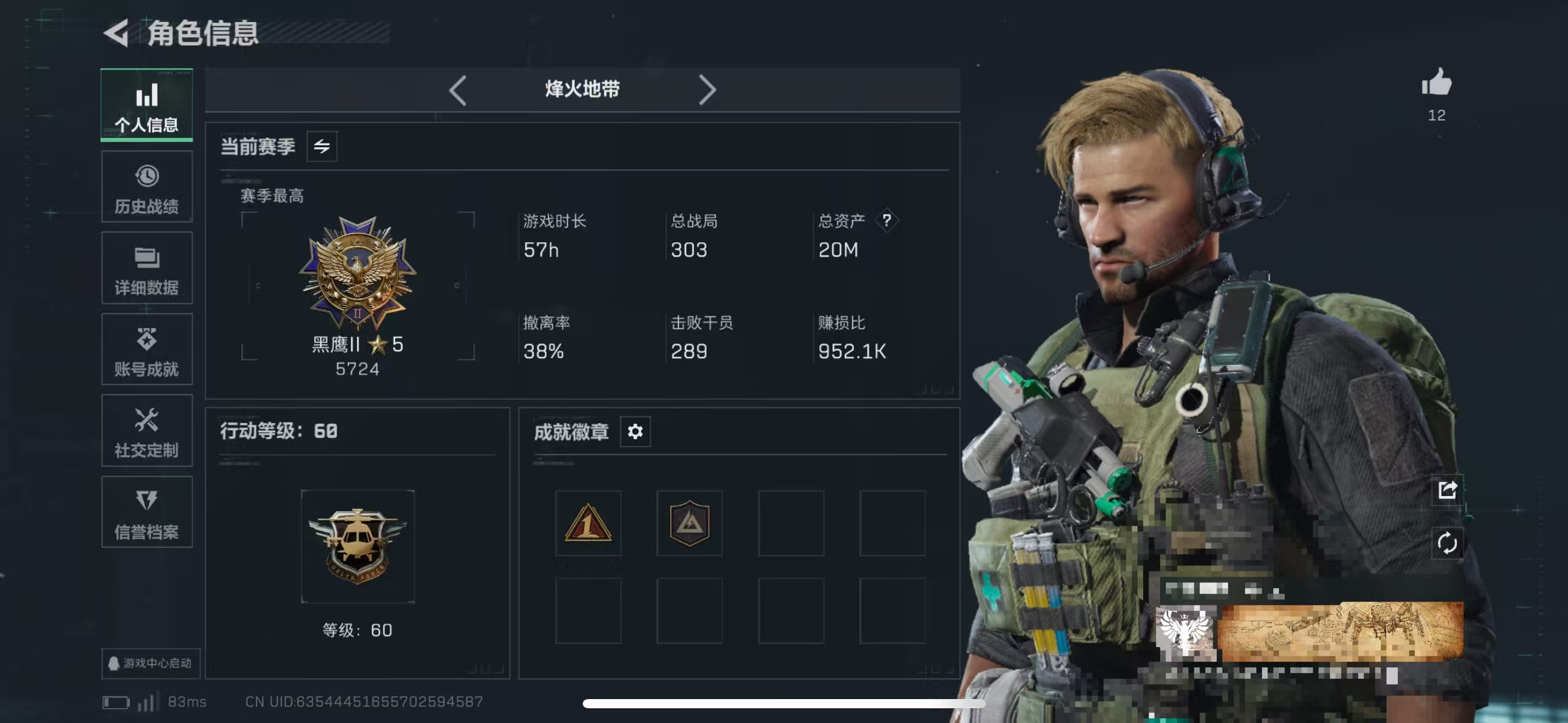 三端互通-总价值20M-哈夫币296k-烽火地带等级60-烽火地带段位黑鹰