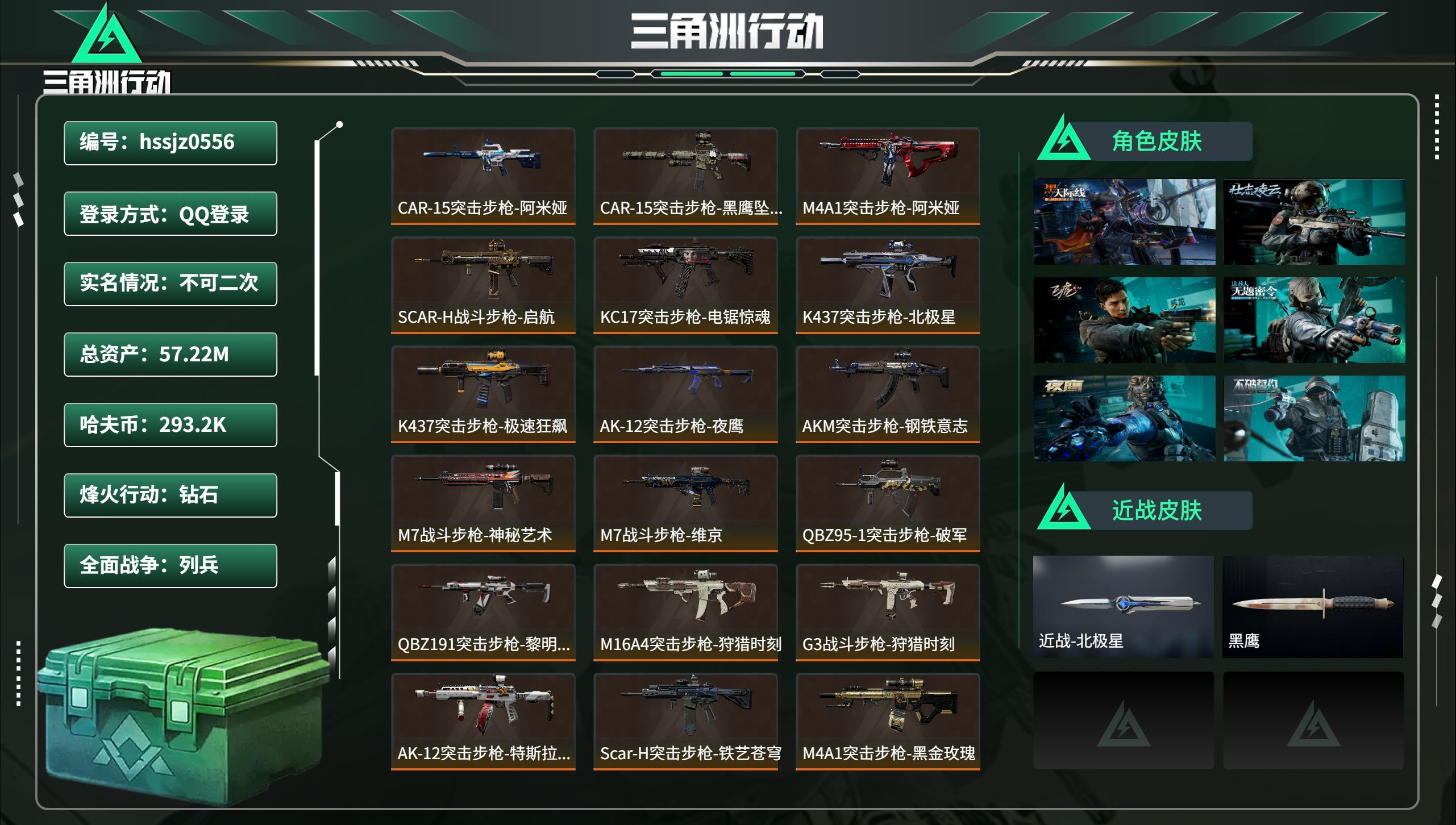总资产57.22M,哈夫币 293.2K,战场等级:50 列兵,行动等级:60 钻石,角色皮肤8,枪