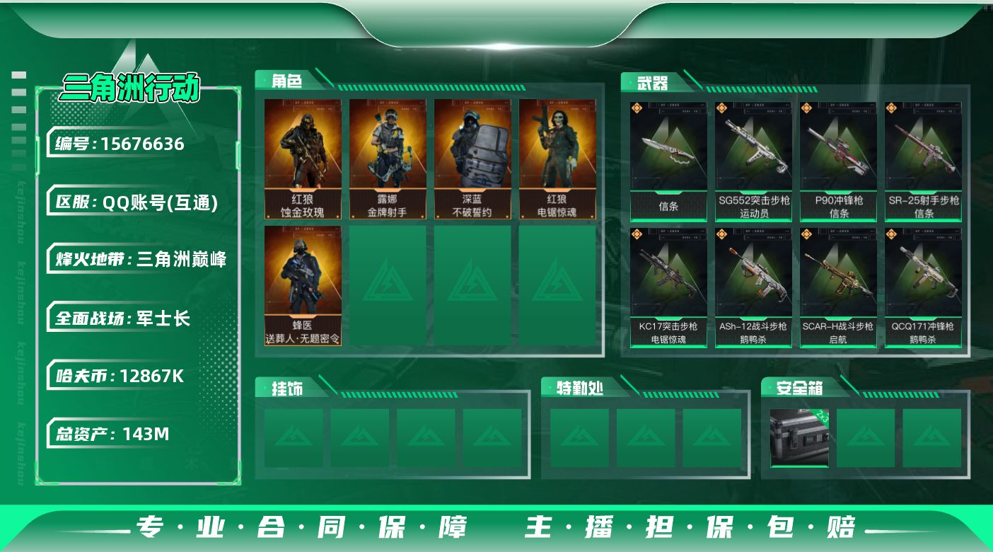 总资产(M):143M/哈夫币(K):12867K/哈夫币(K):12867K/传说枪皮数:21/全