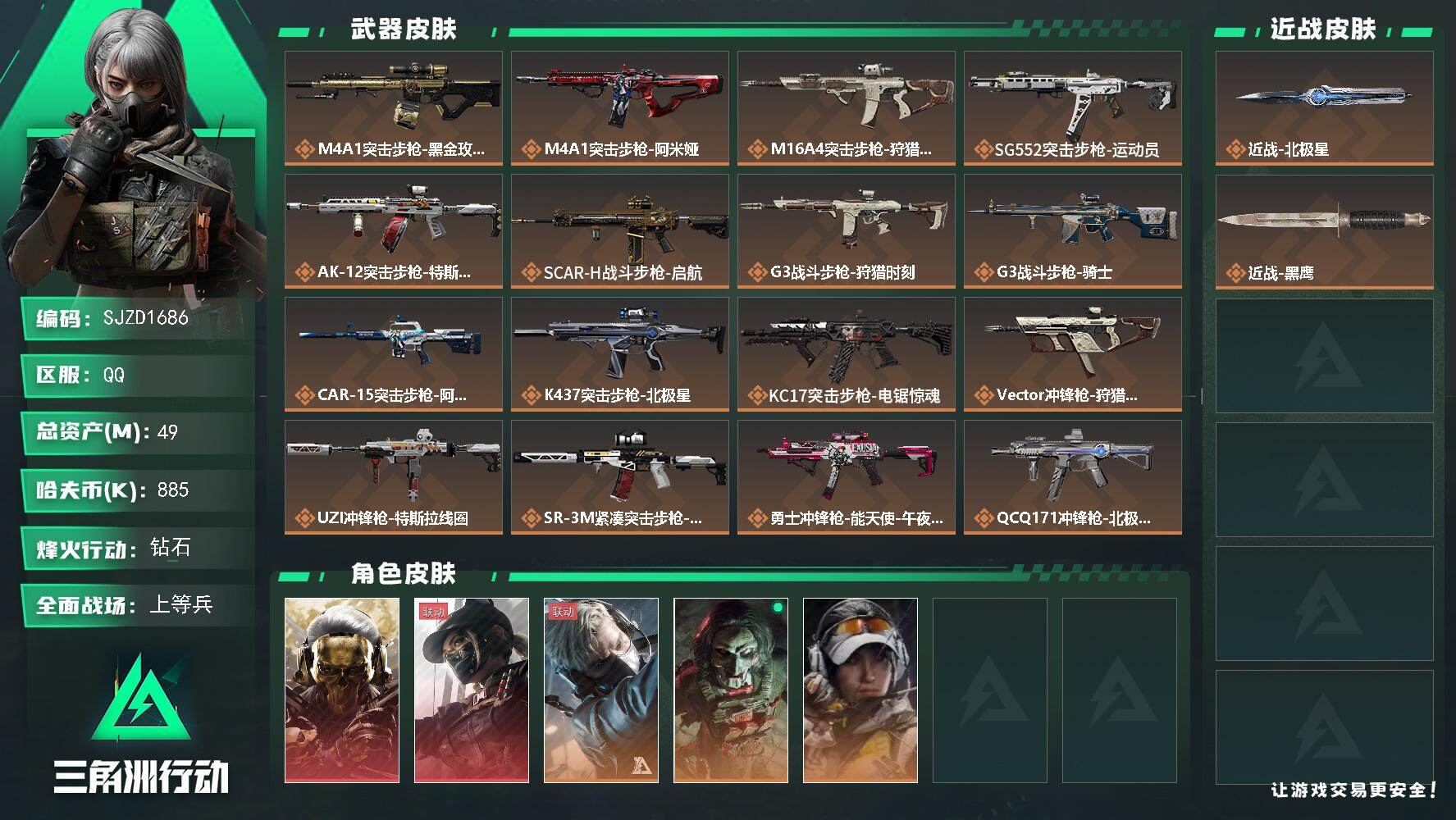 21m总资产-2705k哈伏币-60烽火等级-黑鹰-16战场等级-列兵王者连体