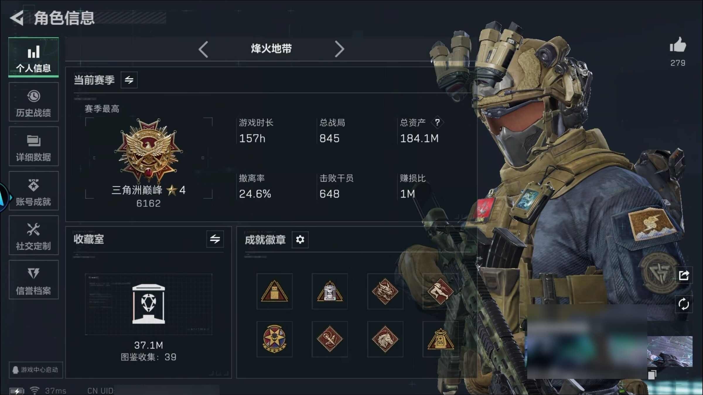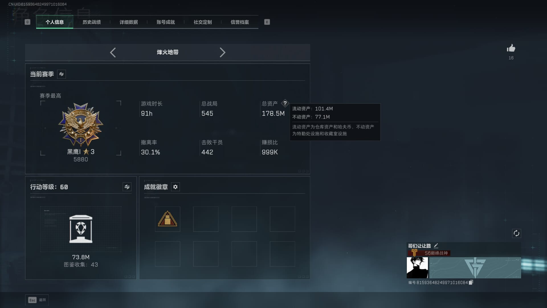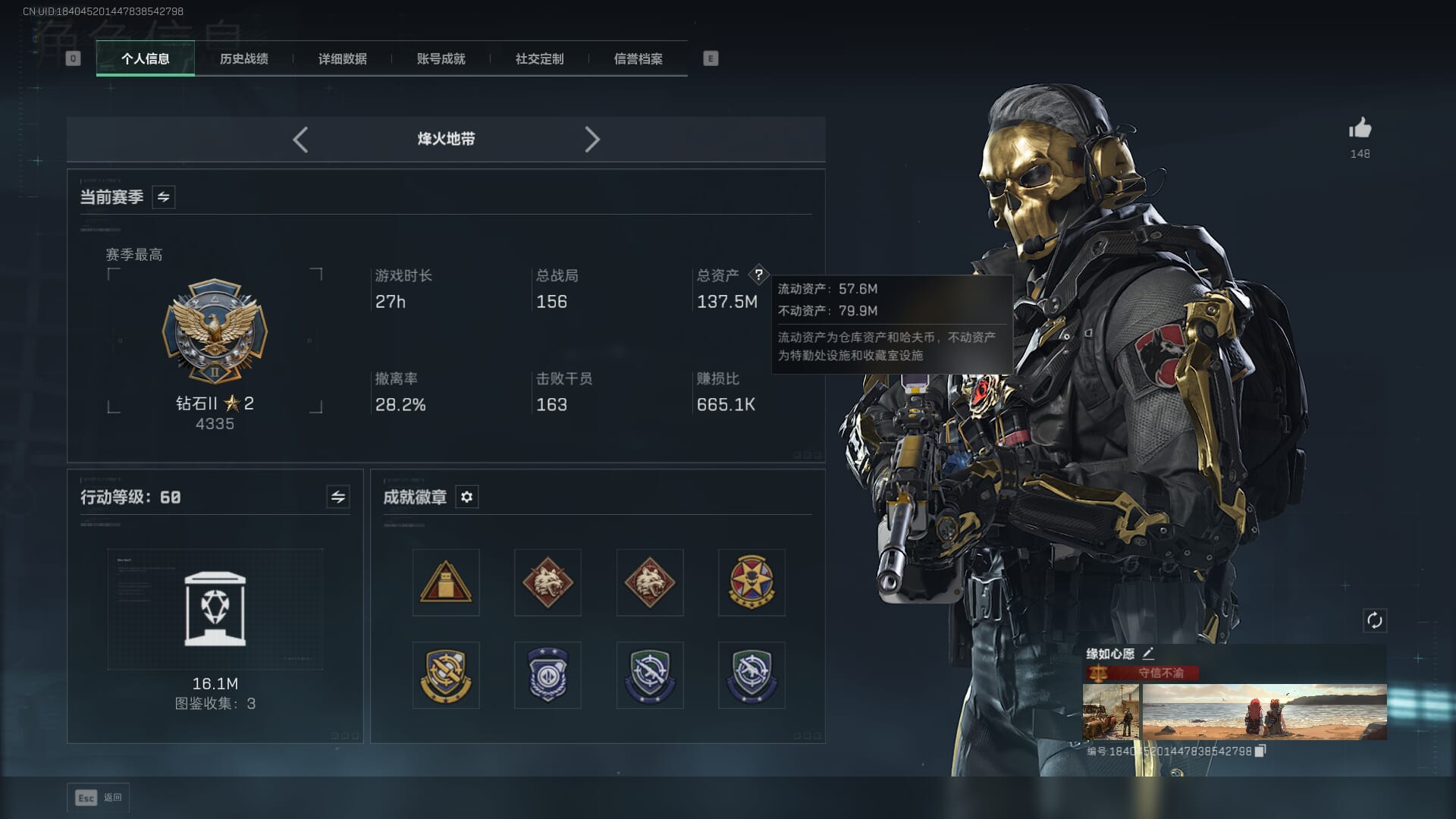 总资产(M):142M/哈夫币(K):284K/传说枪皮数:13/全面战场等级:43_段位:尉官/烽火地带等级:60_段位:黑鹰/