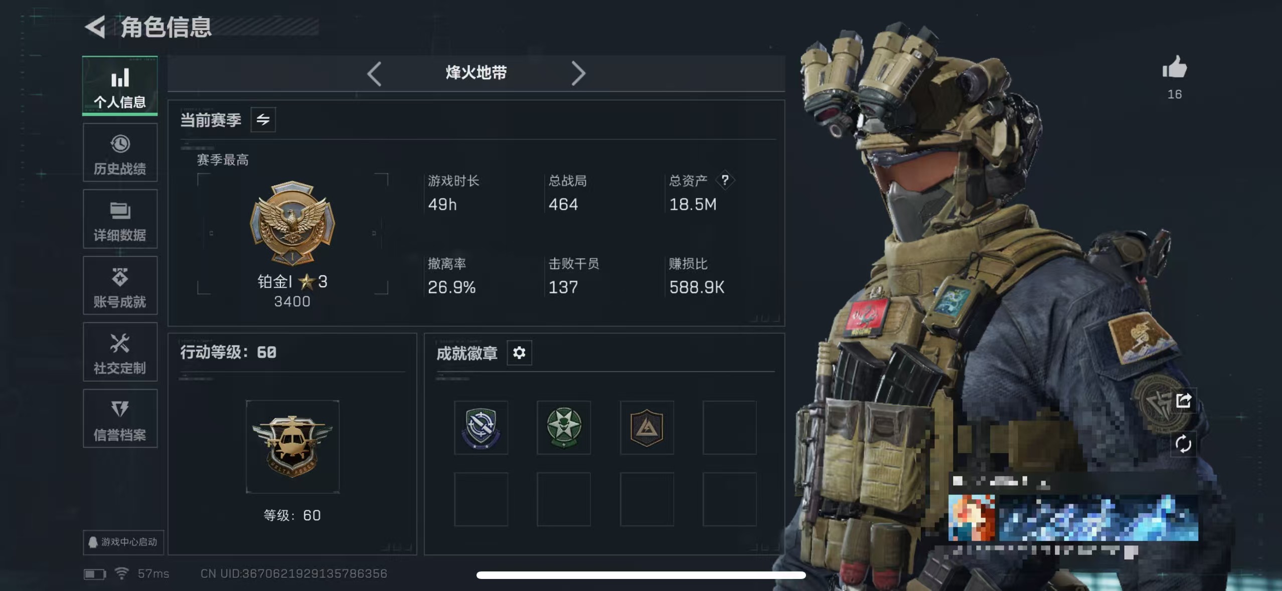 总资产(M):80M/哈夫币(K):1669K/传说枪皮数:23/全面战场等级:1_段位:无段位/烽火地带等级:60_段位:黑鹰
