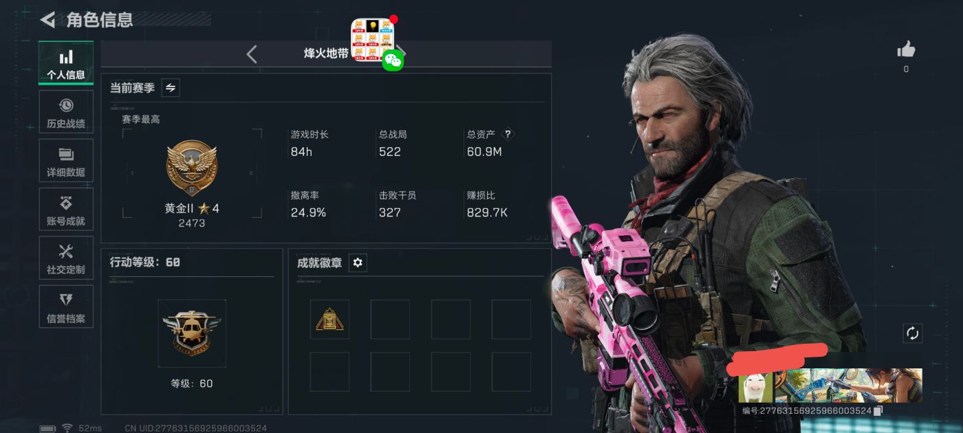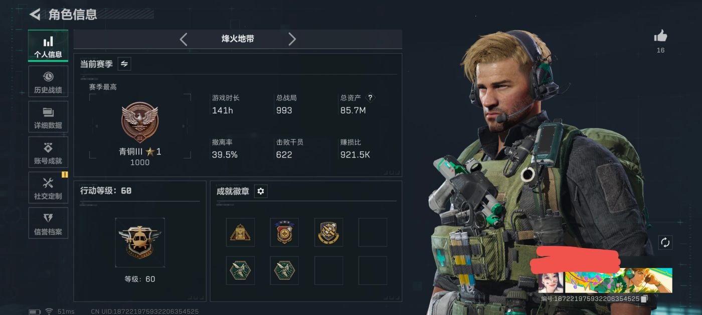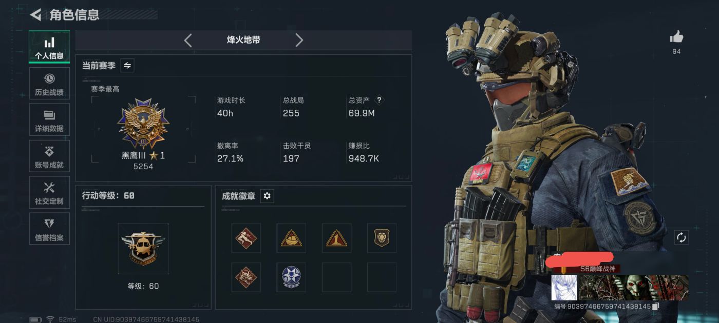 【总资产(M)】45【哈夫币】20k【行动等级】60【烽火地带段位】钻石