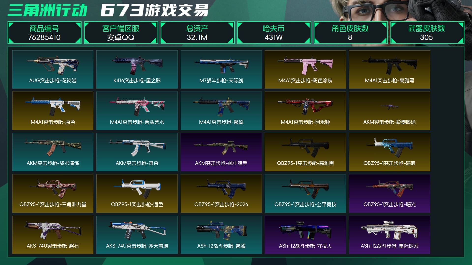 烽火段位钻石1 战场段位尉官4 总资产32.1M 哈夫币431W 干员8 挂饰30 近战2 枪械305 载具19