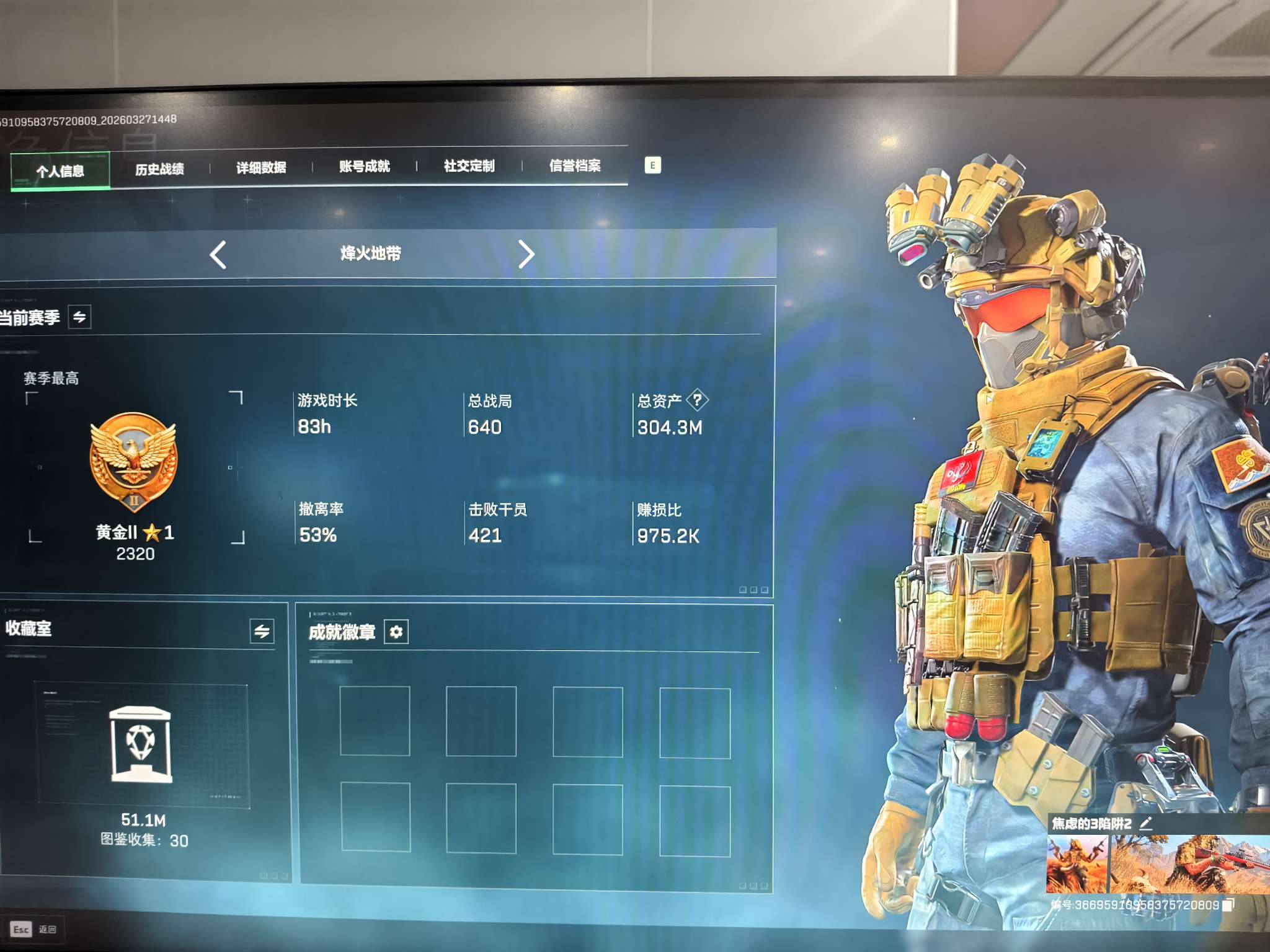 34m总资产-3126k哈夫币-51烽火等级-黑鹰-1战场等级-无军衔【干员