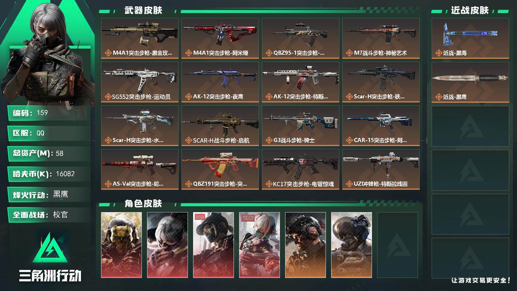 58m总资产-16082k哈伏币-60烽火等级-黑鹰-50战场等级-校官LL5