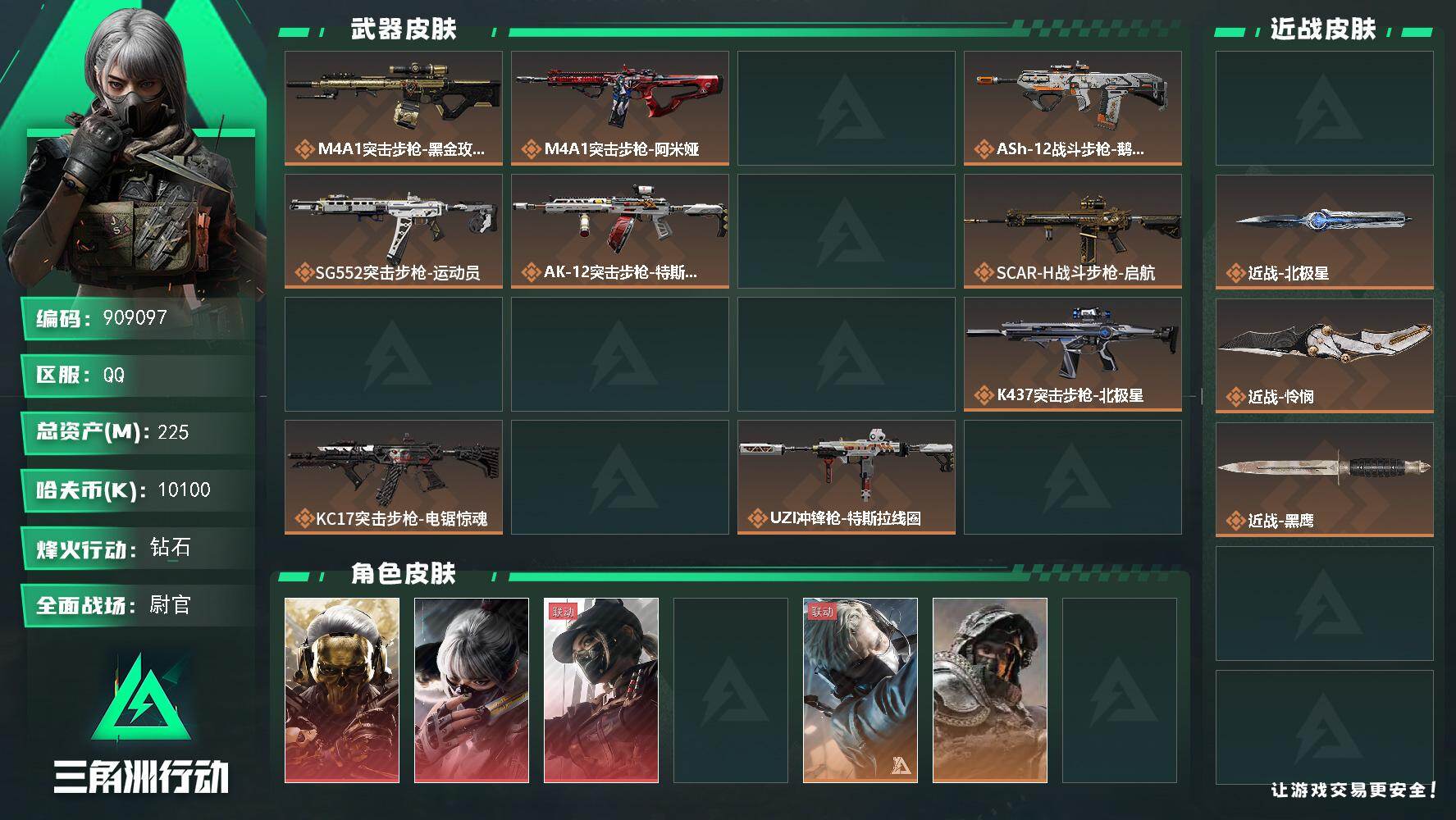 225m总资产-10100k哈夫币-60烽火等级-钻石-50战场等级-尉官【