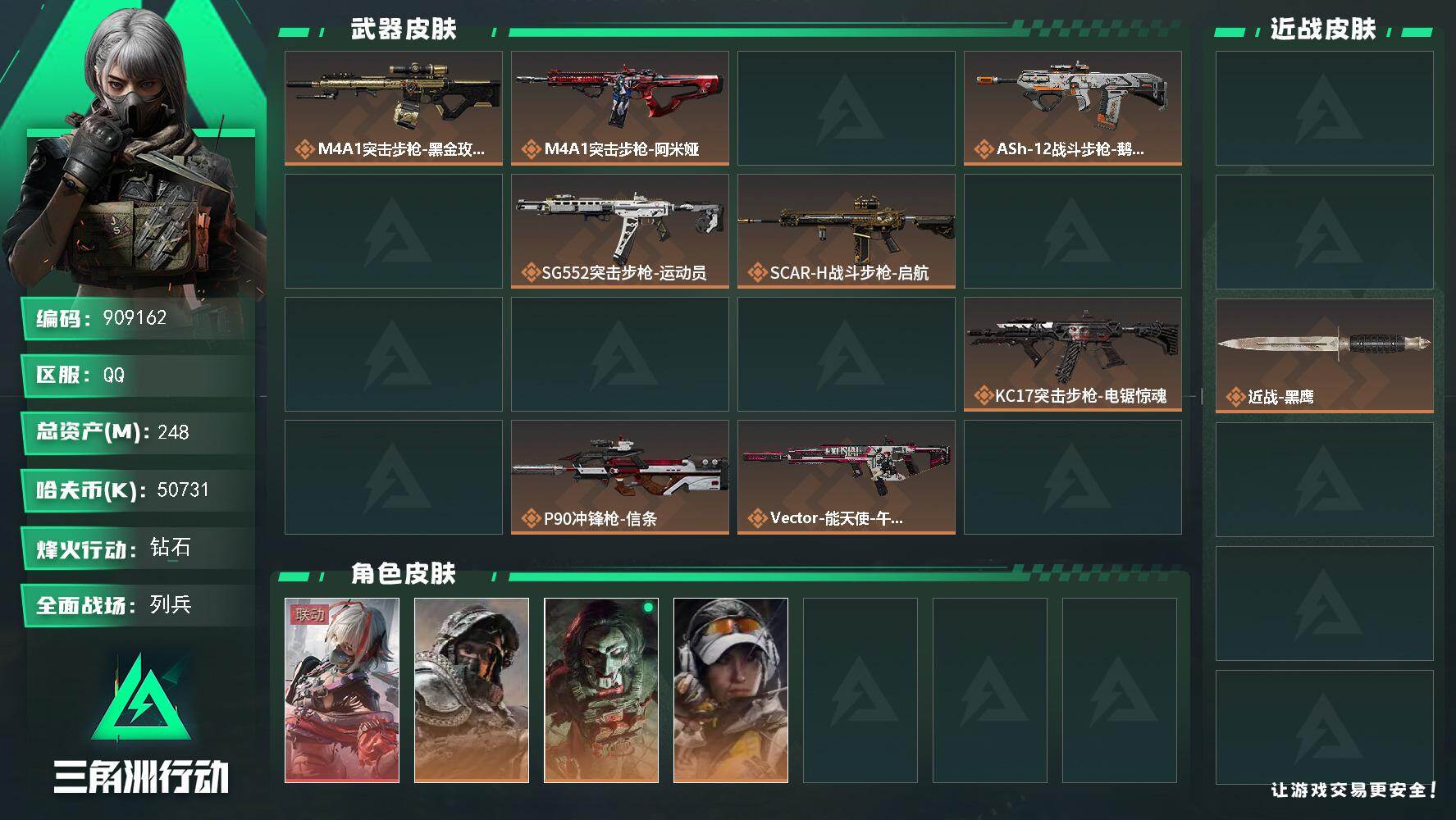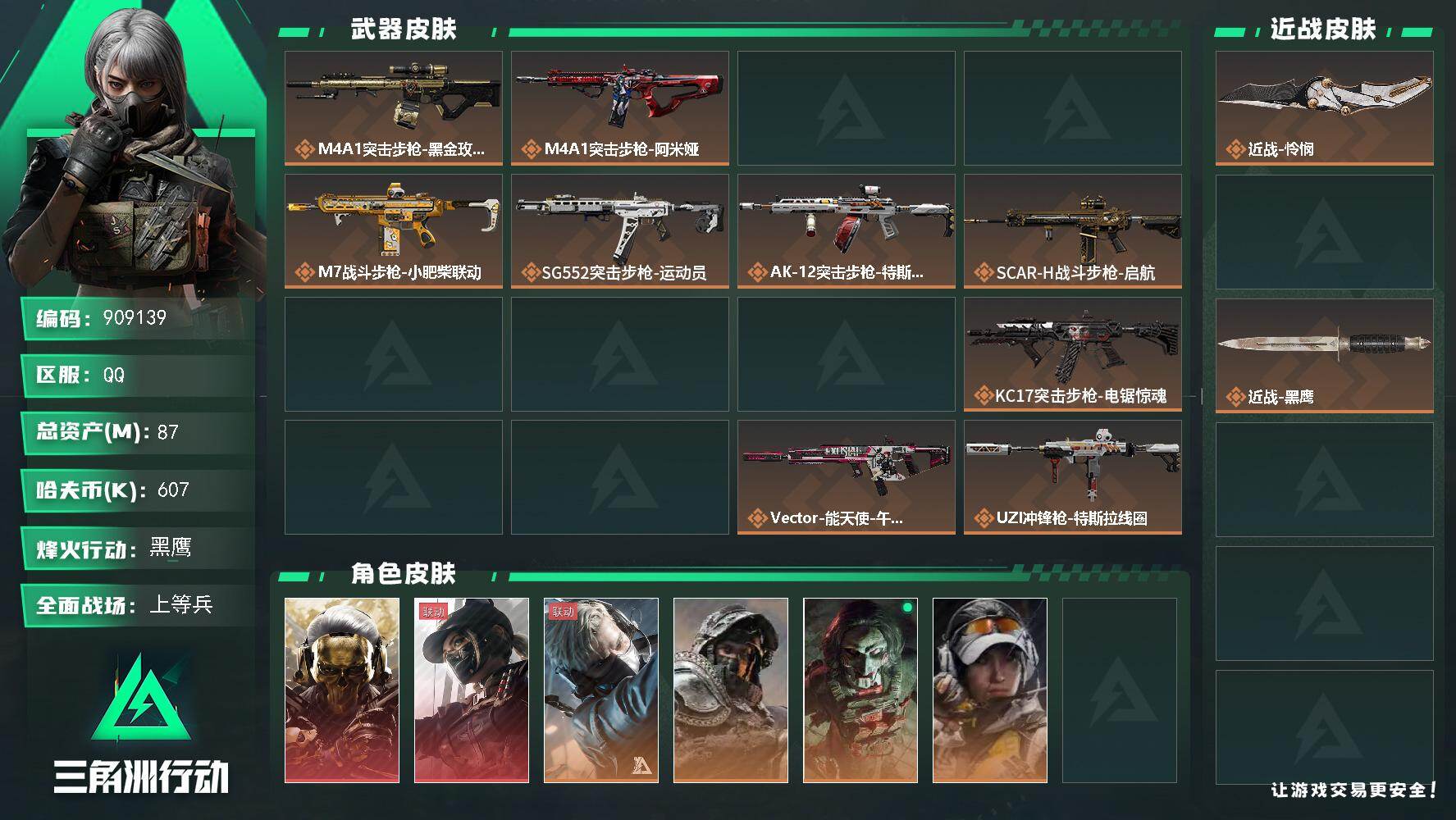 87m总资产-607k哈夫币-60烽火等级-黑鹰-36战场等级-上等兵【干员