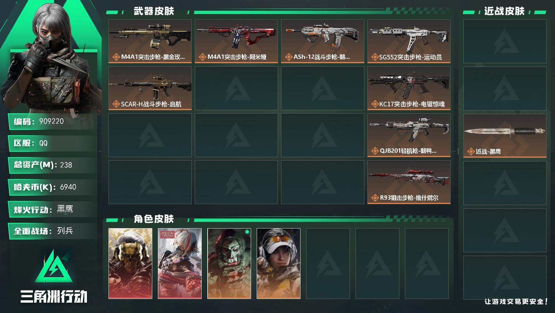 238m总资产-6940k哈夫币-60烽火等级-黑鹰-18战场等级-列兵【干