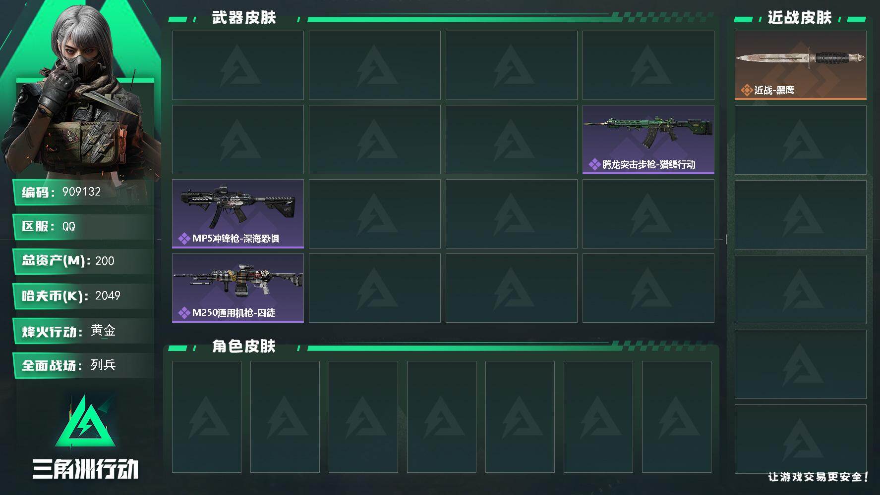 200m总资产-2049k哈夫币-60烽火等级-黄金-6战场等级-列兵【近战