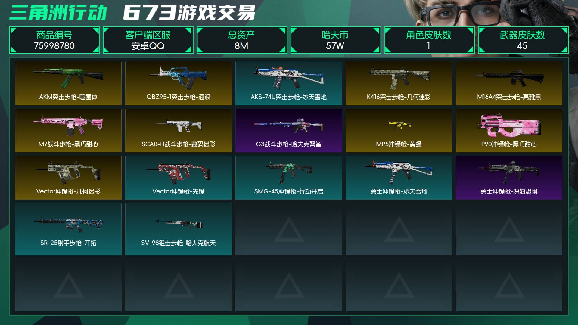 总资产:73.6M 1干员外观 1近战传说 21传说枪械 哈夫币:24.717K