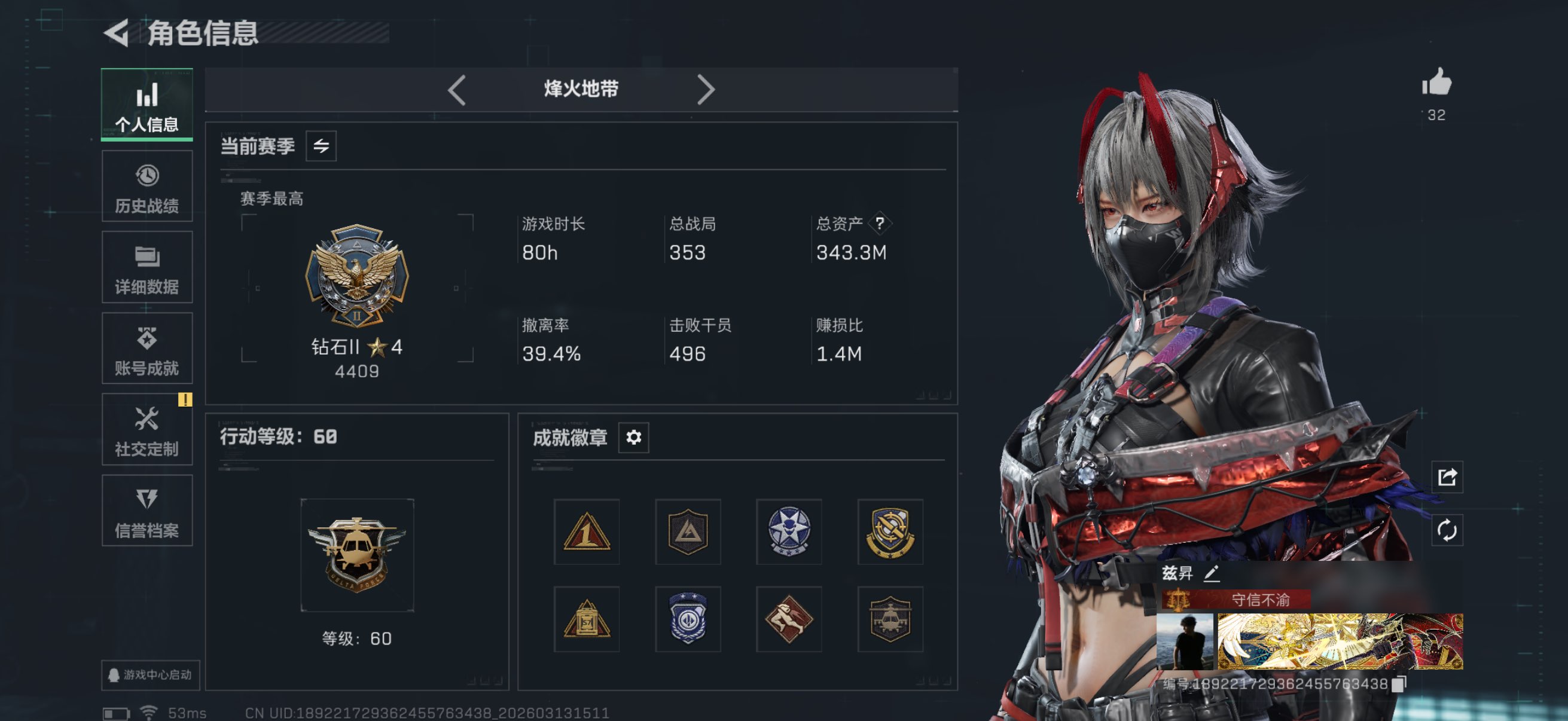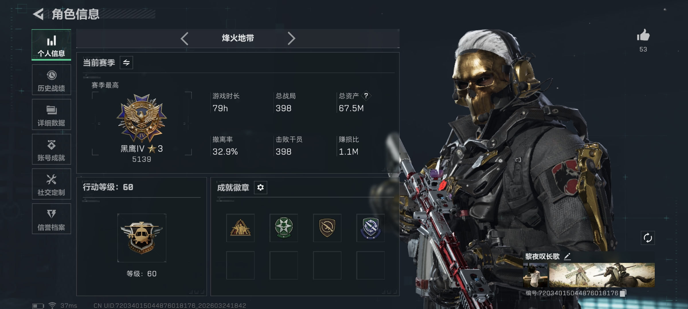 烽火段位钻石3 战场段位军士长1 总资产8M 哈夫币57W 干员1 挂饰5 近战2 枪械45 载具3