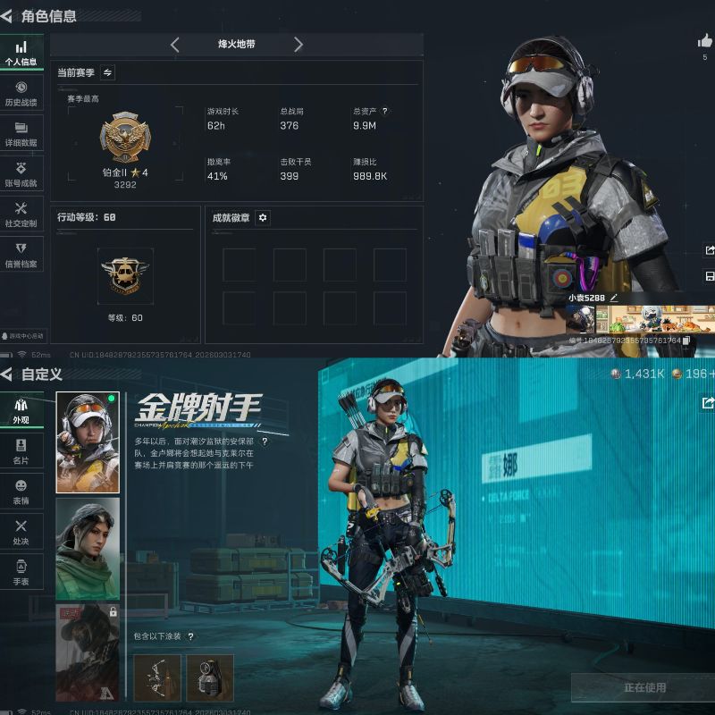 DD474安Q三角洲满级号【1金皮-露娜-金牌射手 总资9.9M 烽火等级60-1431K哈弗币】【1干员】露娜-金牌射手 段位-铂金Ⅱ