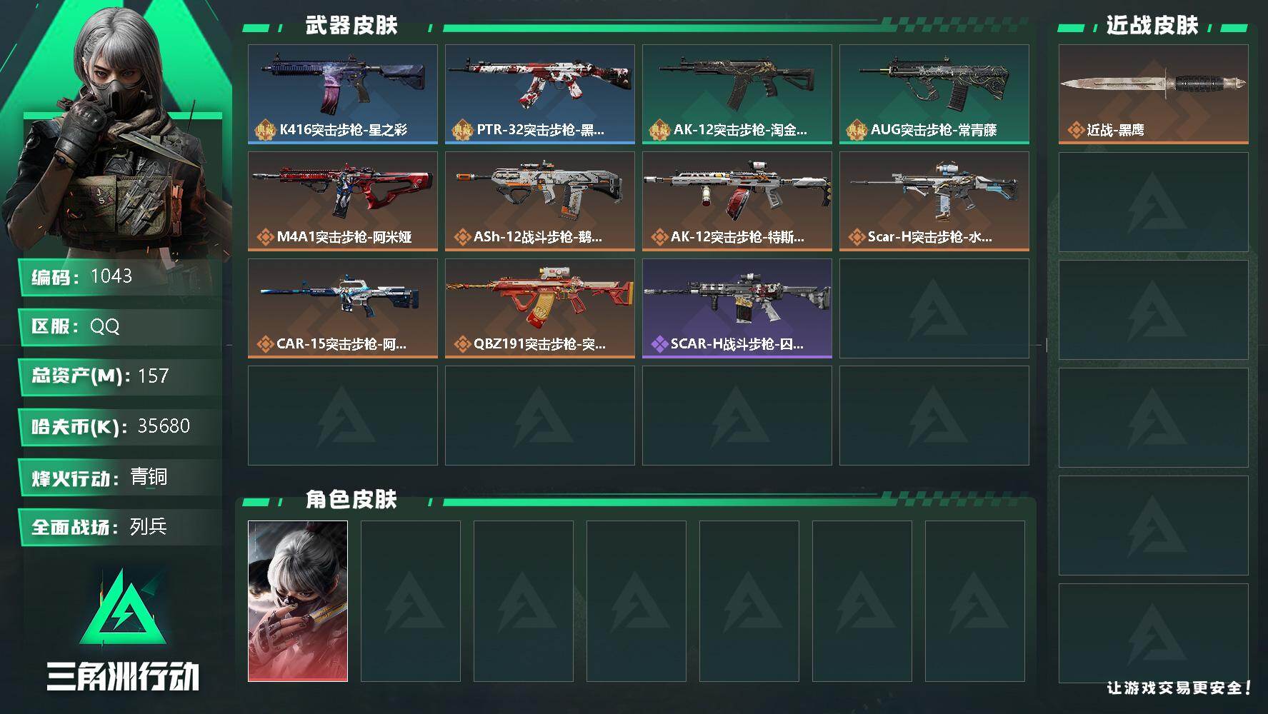 总资产:157.1M,哈夫币:3568W,武器皮肤93,烽火60级